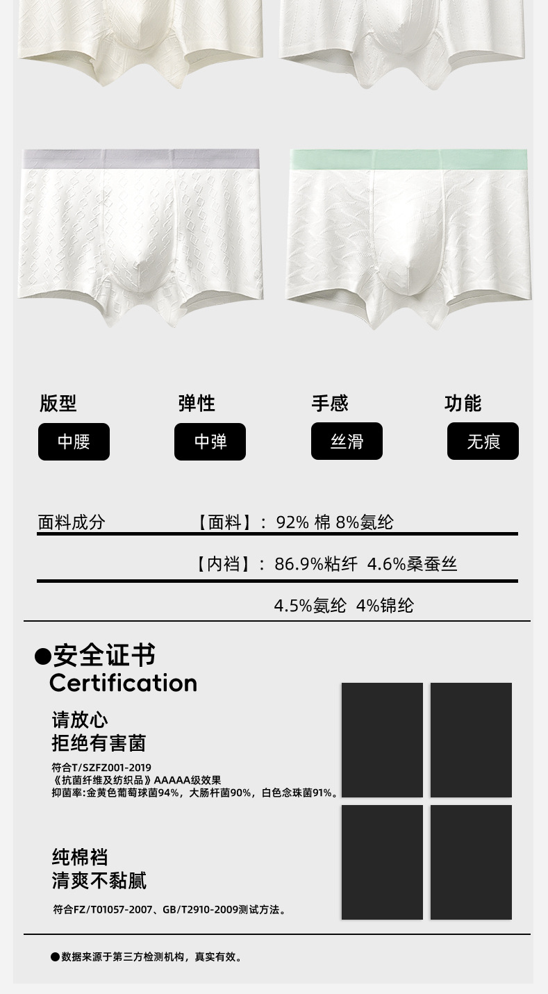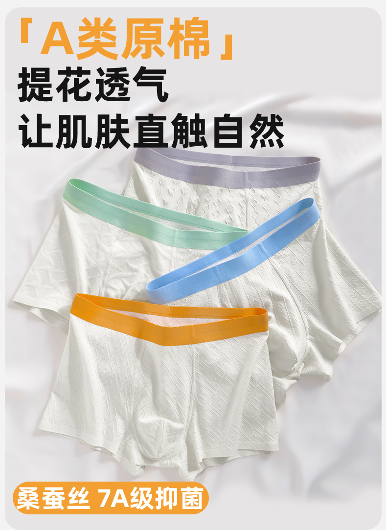 a类提花原生棉男士内裤无痕透气7A桑蚕丝抗菌男生大码四角平角裤