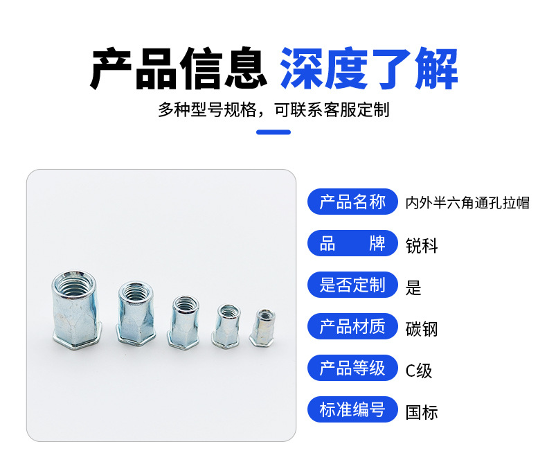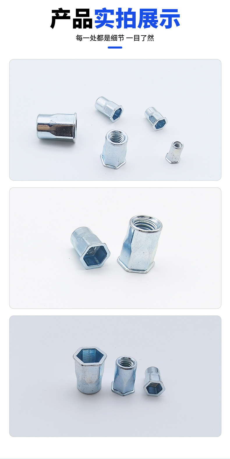 现货小头内外半六角通孔拉帽碳钢镀环保蓝白锌拉铆螺母五金配件长,批发价,价格:0.05,厂家直销,现货小头内外半六角通孔拉帽碳钢镀环保蓝白锌拉铆螺母五金配件长,免费拿样。