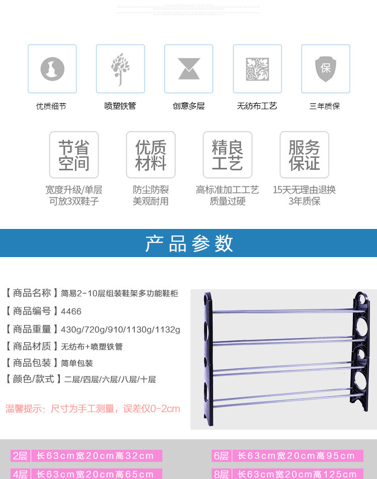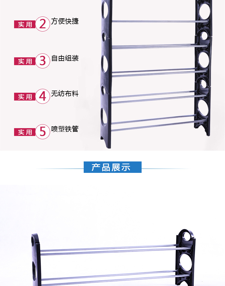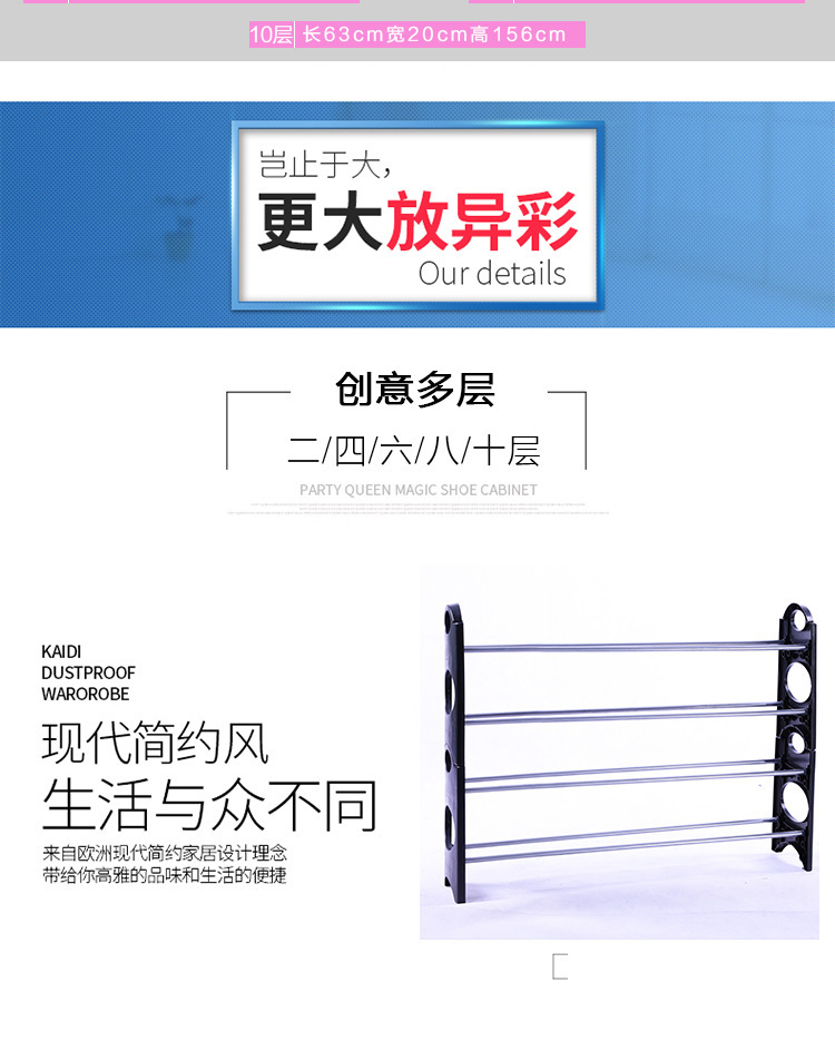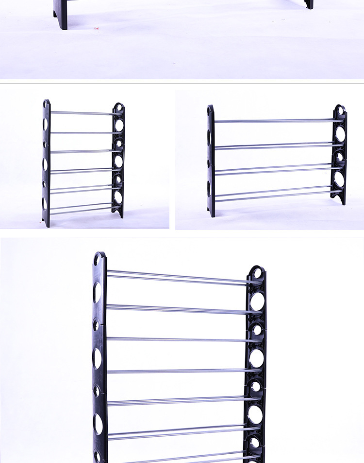 此款鞋架是新款,人性化设计,可以随意拆装,完整产品为4层或10层,可随心所欲组合,2层,4层,6层,8层,10层。多孔位人性化设计,满足大人小孩子鞋子不同尺寸的需求调整。每层有63CM所以放上3双鞋子是绝是很空余, 我们创造有生命的产品,我们创造有社会价值的产品。...........