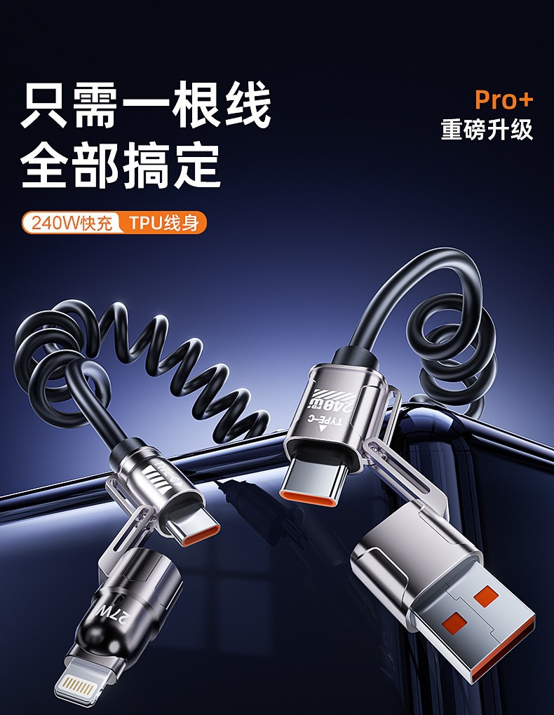 弹簧240w四合一充电线可拉伸调节长度手机数据线适用车载快充线,批发价,价格:6.5,厂家直销,弹簧240w四合一充电线可拉伸调节长度手机数据线适用车载快充线,免费拿样。