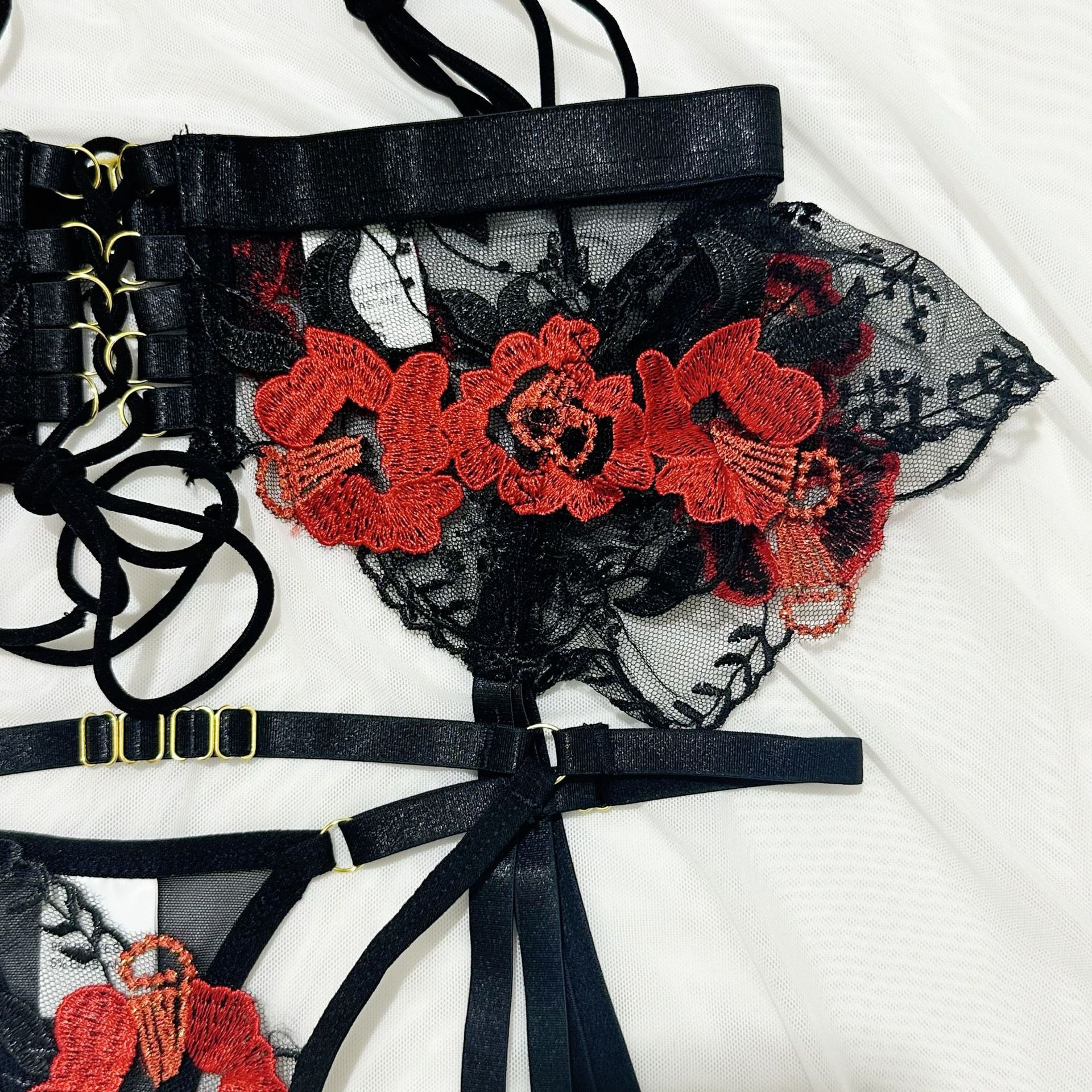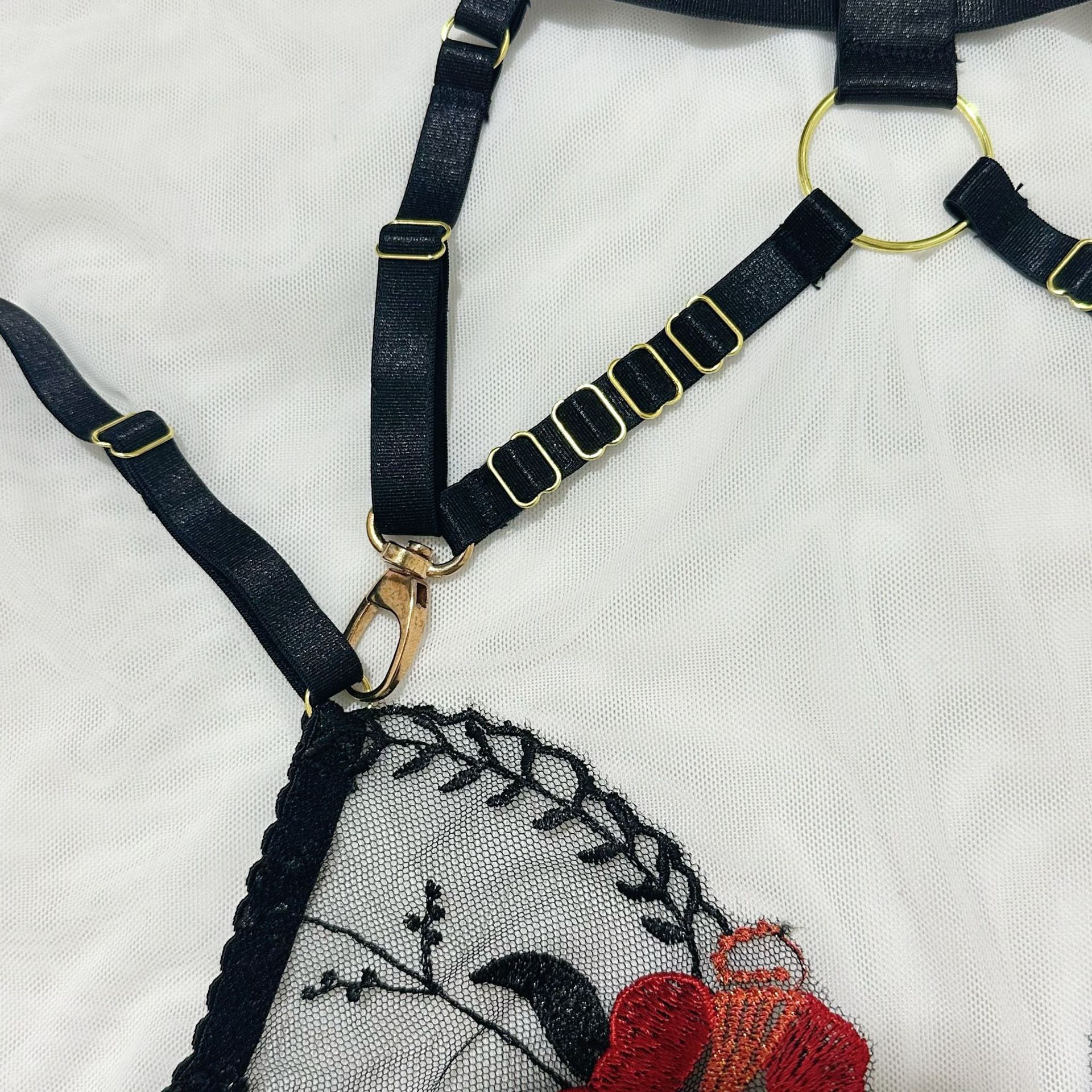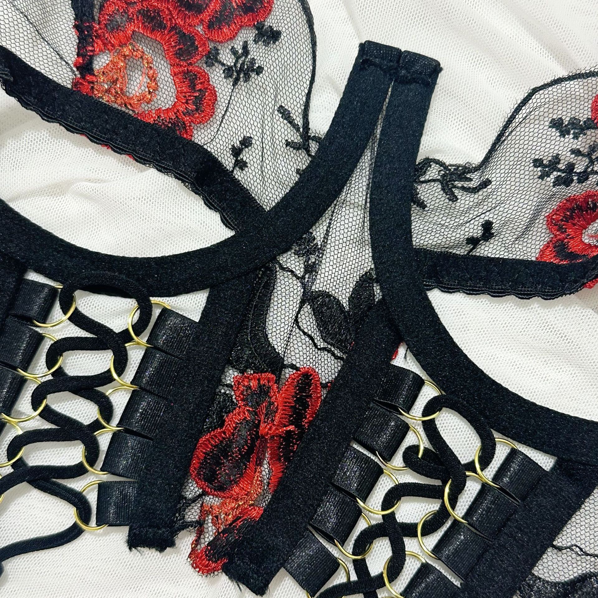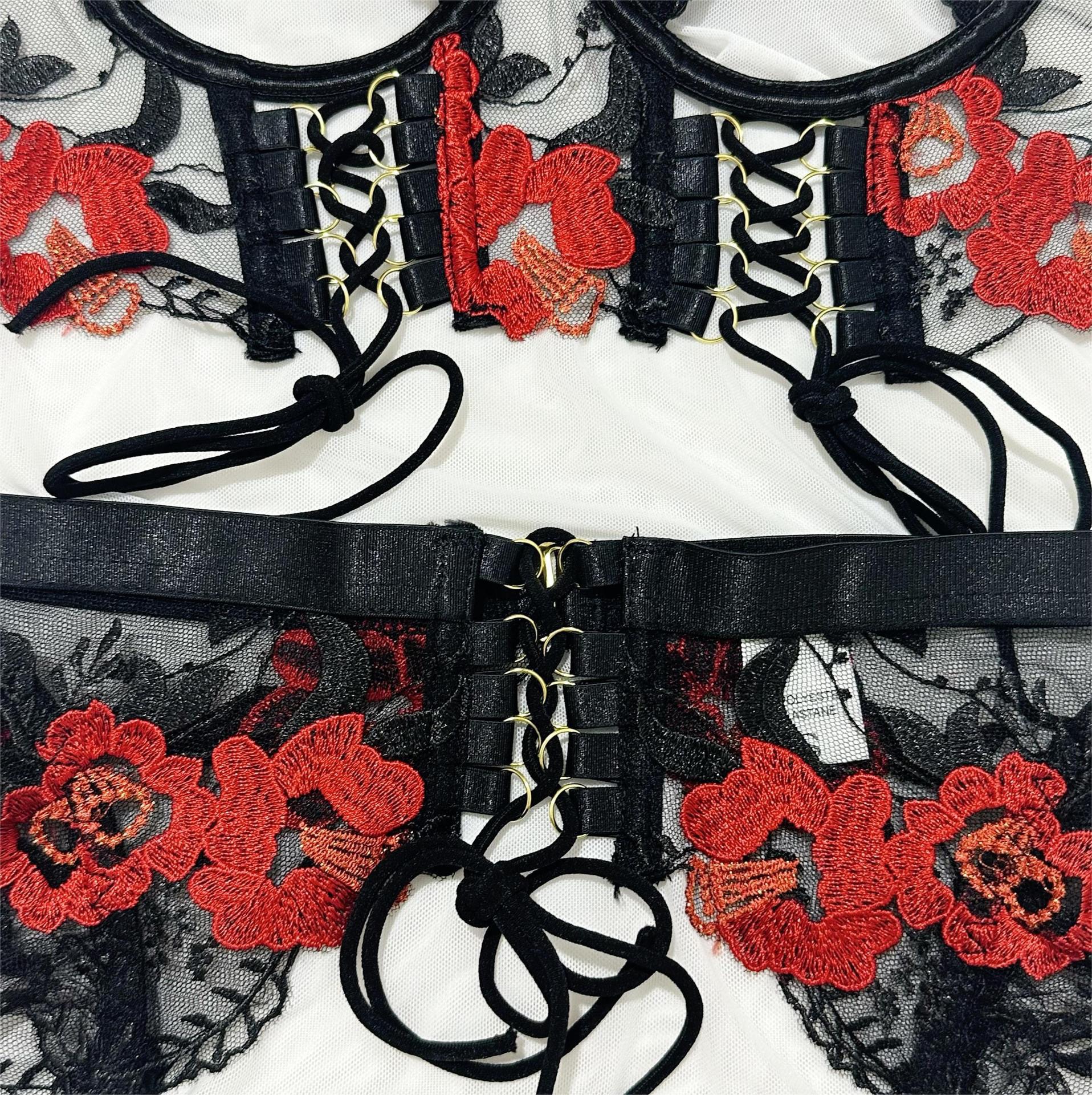 欧美爆款女装情趣内衣重工刺绣花朵挂脖金属扣绑带交叉镂空四件套