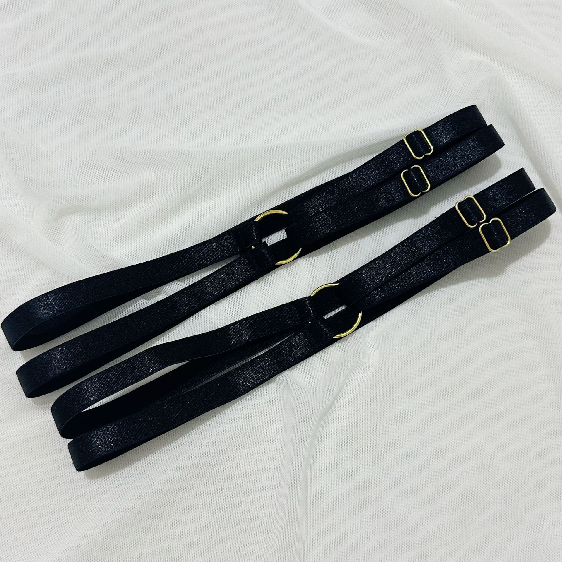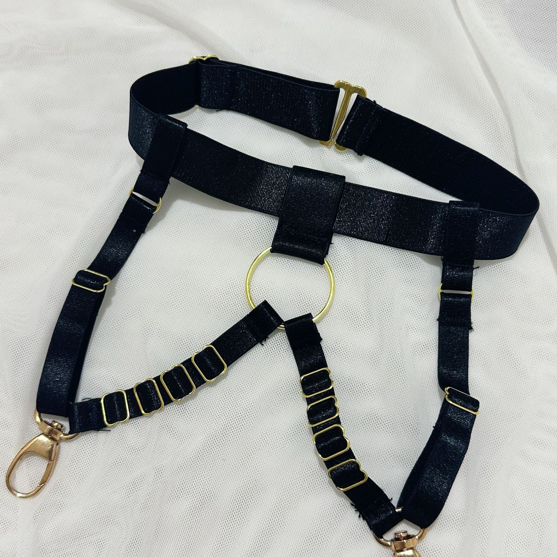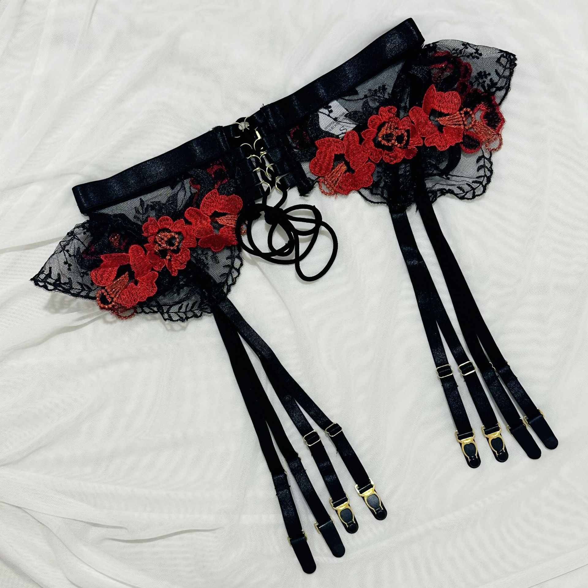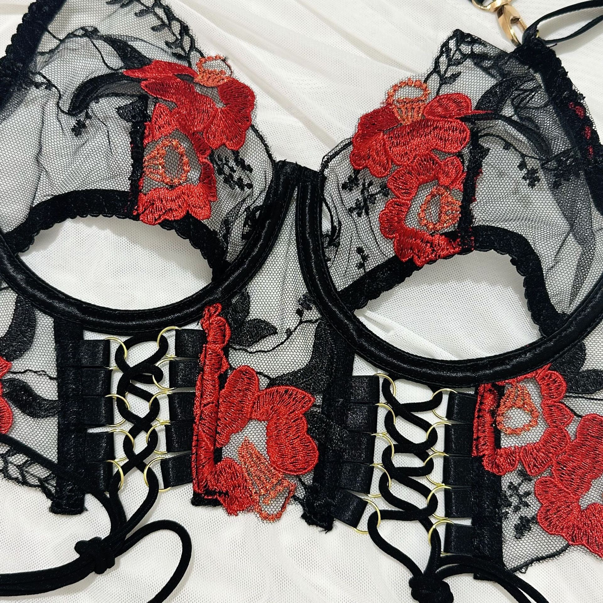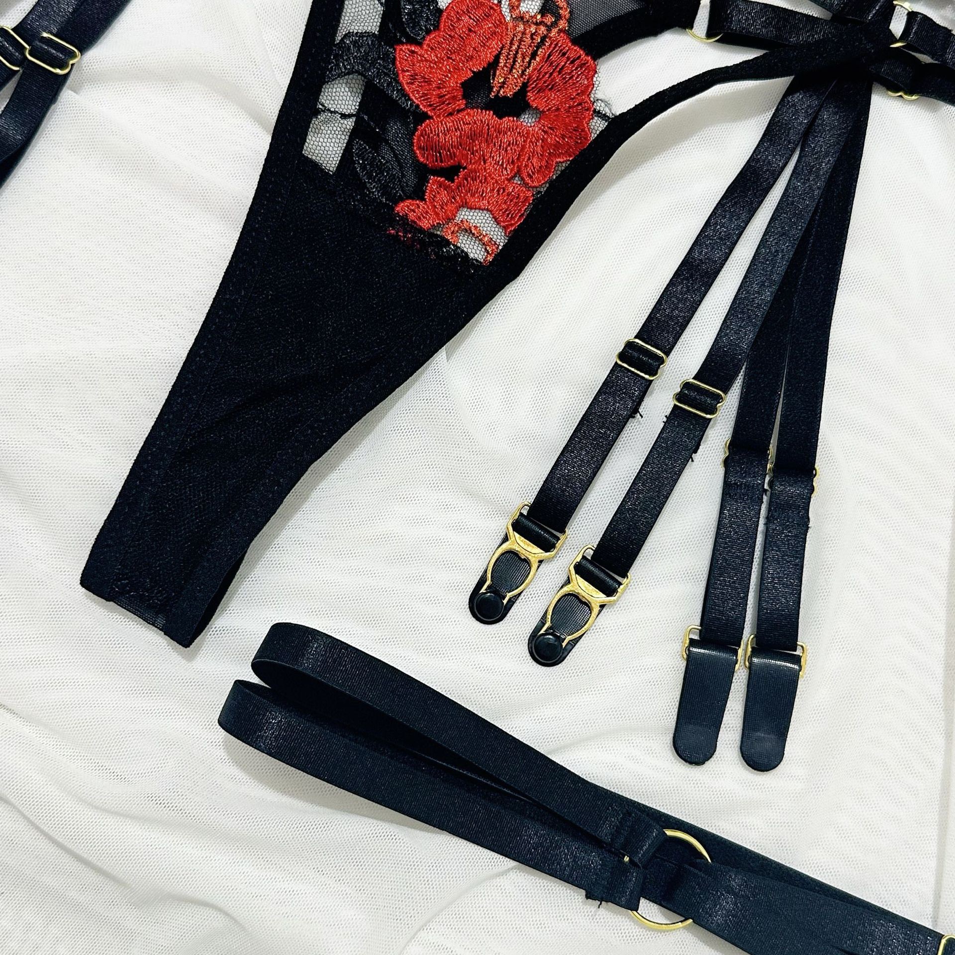 欧美爆款女装情趣内衣重工刺绣花朵挂脖金属扣绑带交叉镂空四件套