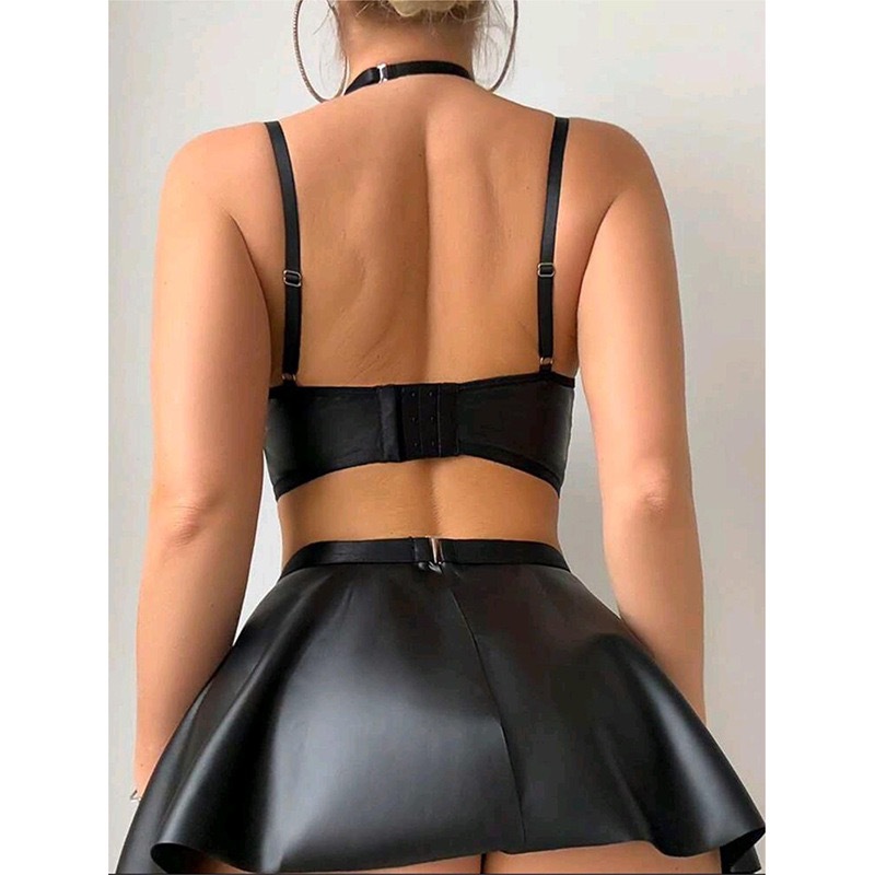跨境货源新款情趣内衣性感漆皮网纱拼接纯欲辣妹短裙套装纯色皮质