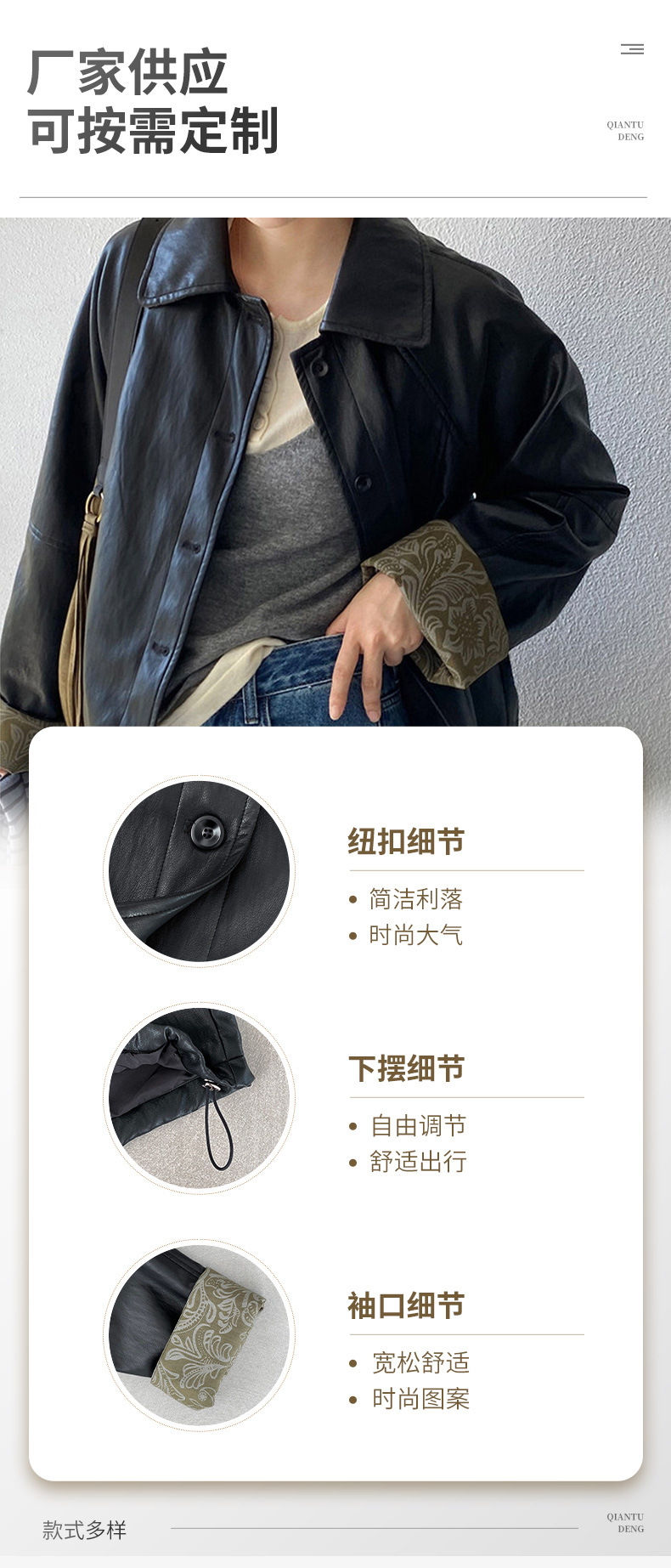 2025年复古翻领pu皮黑外套女夹克上衣甜酷风短款挽袖宽松机车夹克,批发价,价格:129,厂家直销,2025年复古翻领pu皮黑外套女夹克上衣甜酷风短款挽袖宽松机车夹克,免费拿样。