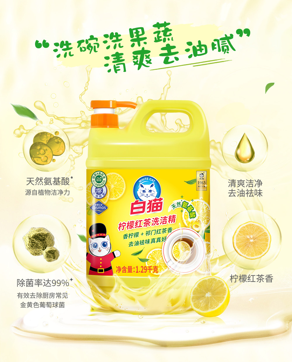白猫洗洁精家用家庭装洗涤剂厨房洗涤灵实惠装洗洁剂大桶去油蜜桃