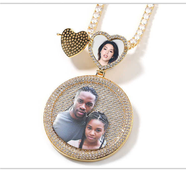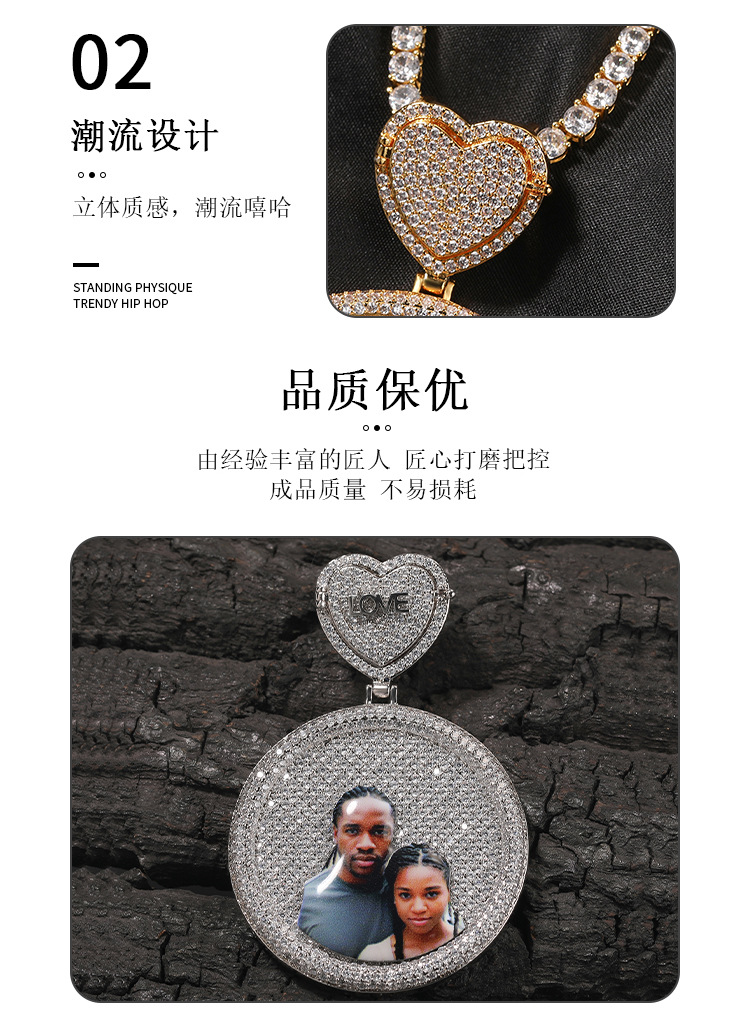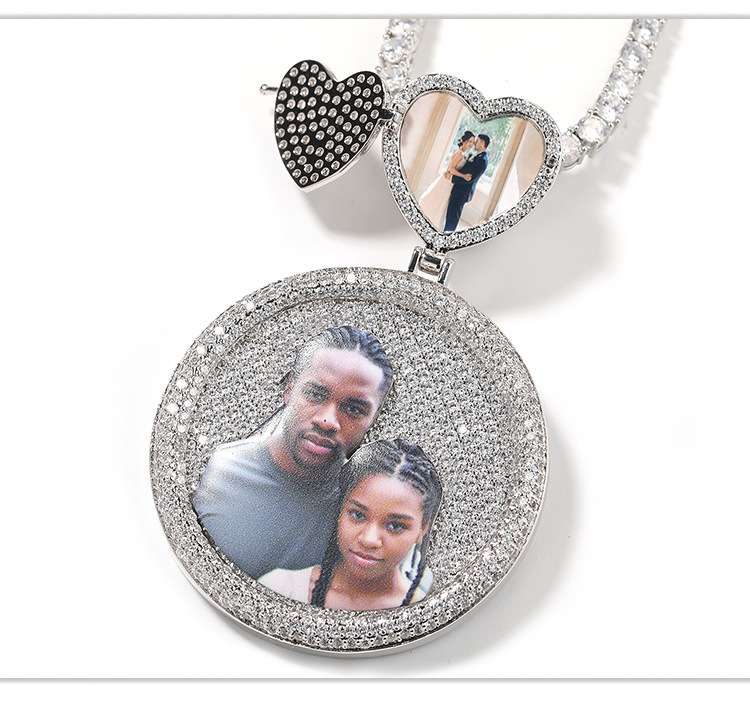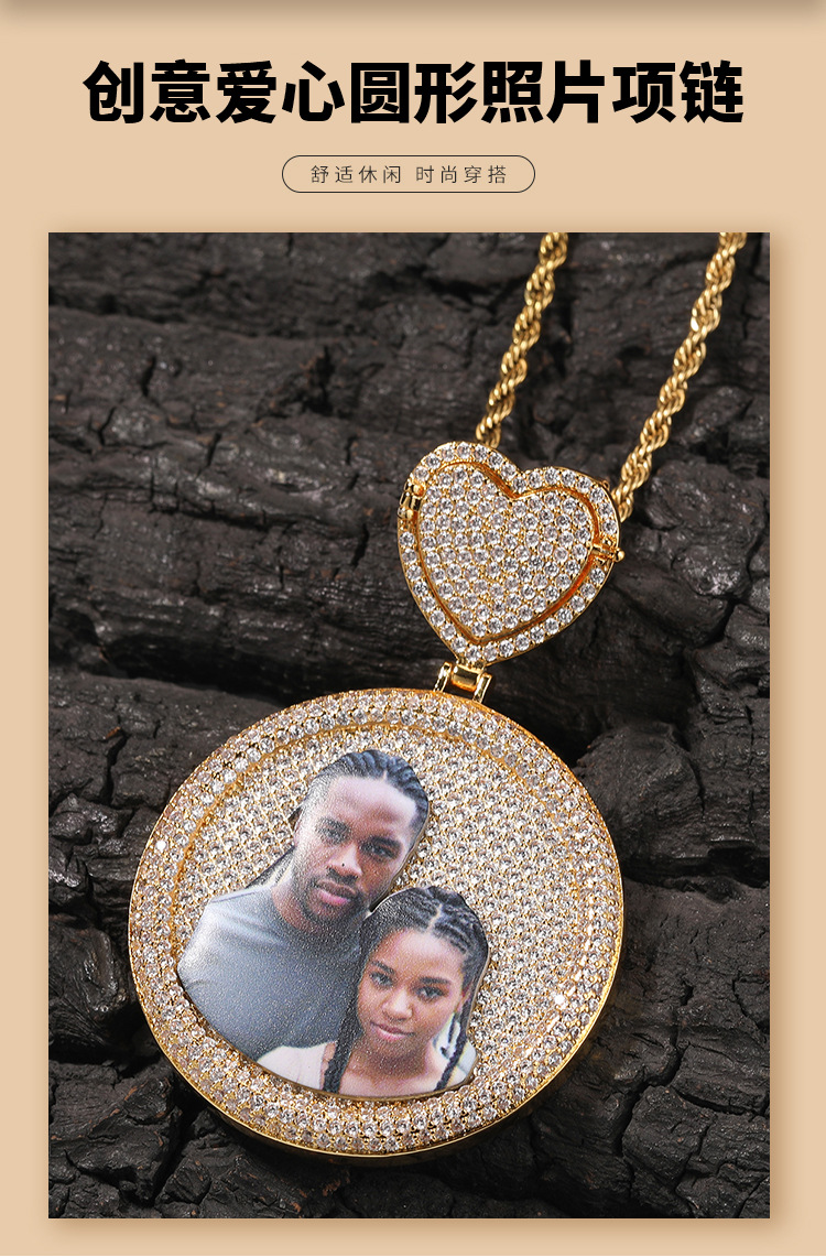 欧美嘻哈跨境爱心扣照片吊坠铜镶锆石潮流饰品记忆圆形吊坠定制