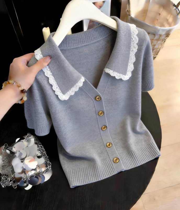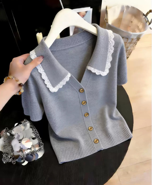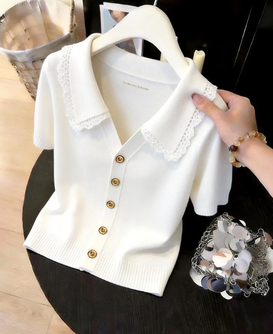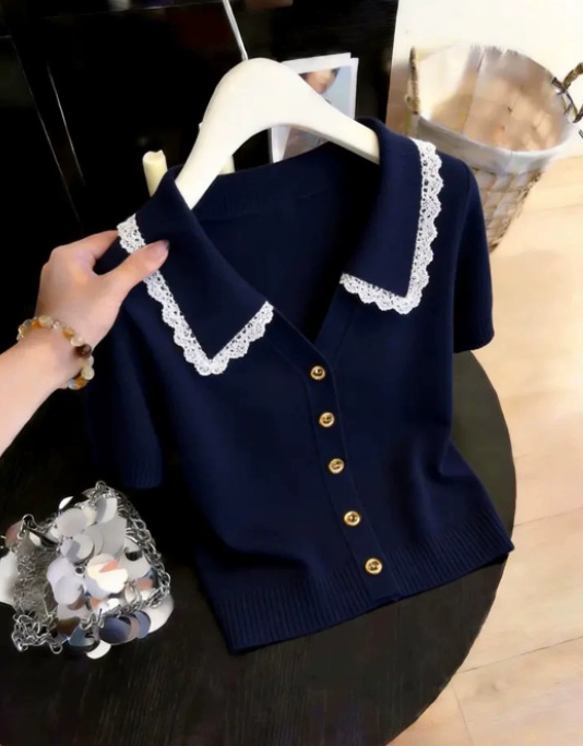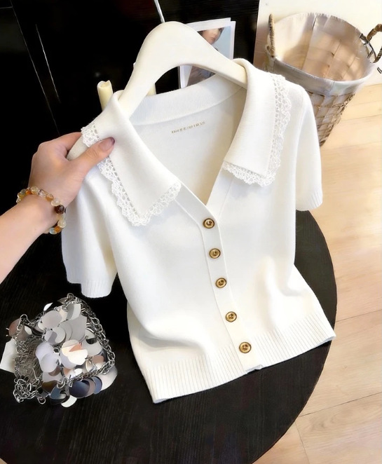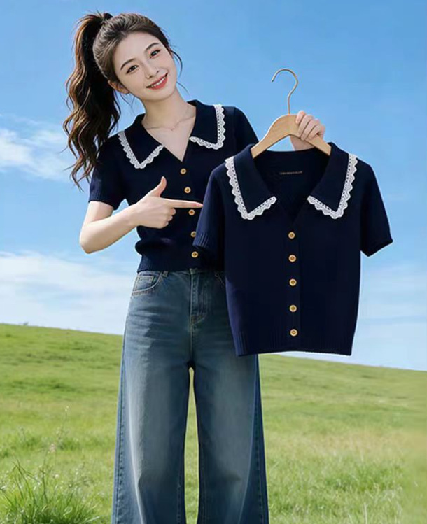 韩系蕾丝polo领针织短袖T恤女装2026夏季新款辣妹休闲气质短上衣,批发价,价格:33,厂家直销,韩系蕾丝polo领针织短袖T恤女装2026夏季新款辣妹休闲气质短上衣,免费拿样。