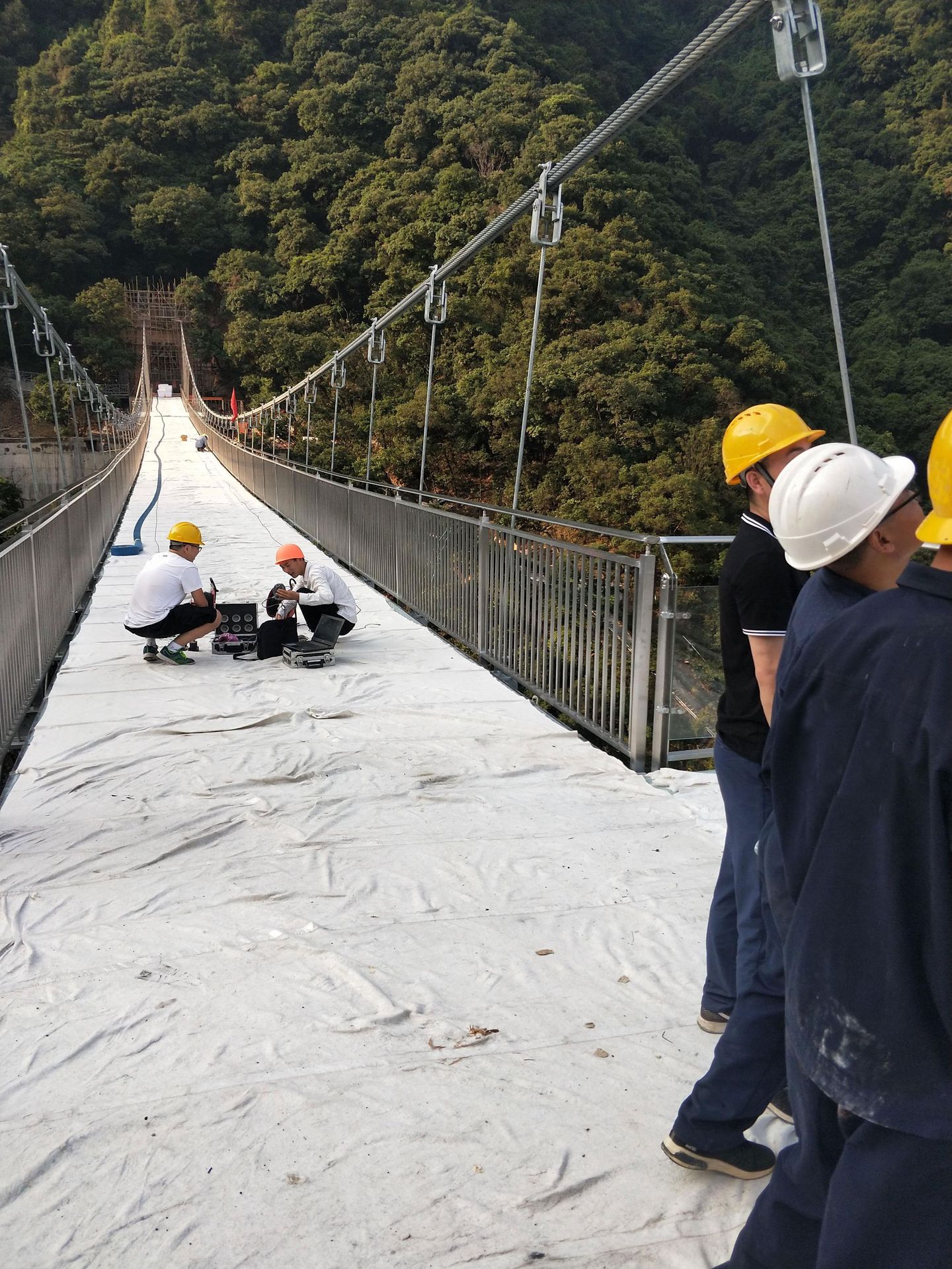 玻璃吊桥指的是以通过索塔悬挂并锚固于两岸(或桥两端)的缆索(或钢链)作为上部结构主要承重构件的桥梁。其缆索几何形状由力的平衡条件决定,一般接近抛物线。从缆索垂下许多吊杆,把桥面吊住,在桥面和吊杆之间常设置加劲梁,同缆索形成组合体系,以减小荷载所引起的挠度变形,桥面为夹胶玻璃。由于玻璃吊桥的特性,承载索位于桥梁上方。此种吊桥的优点在于结构稳定、适合大跨度,外表壮观,行走在桥面非常刺激。