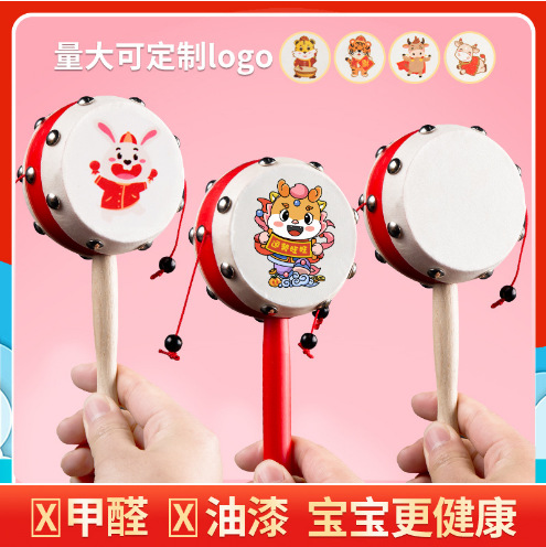 拨浪鼓婴儿玩具可啃咬手摇波鼓宝宝木质羊皮传统儿童新生儿男女孩