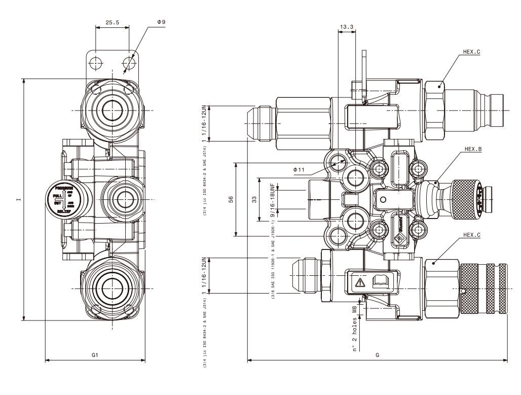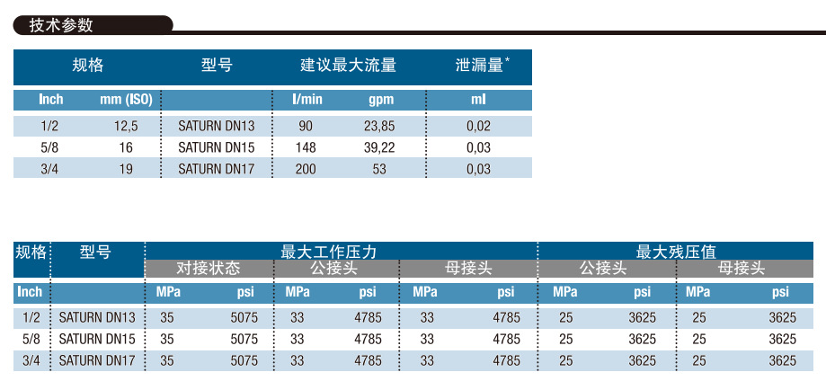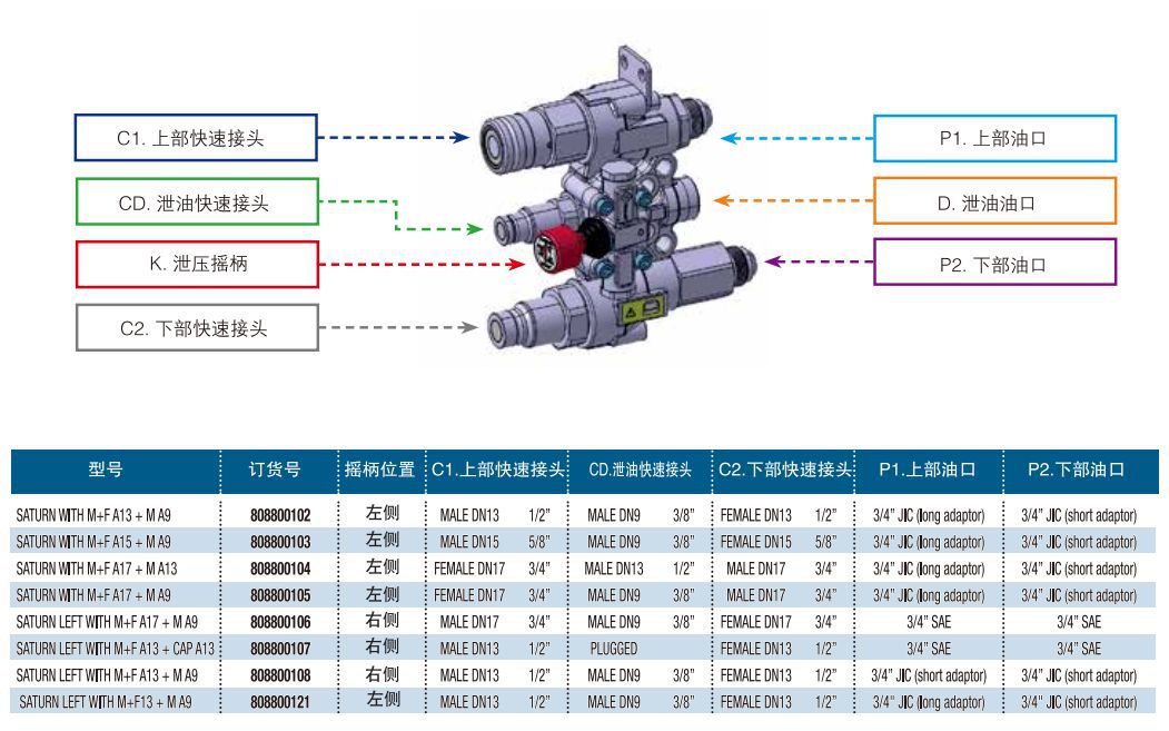 SATURN 赛腾模块配置符合 ISO 16028 互换性标准的平面阀快速接头,可用于多种规格配置的模块化设计,同一个模块上可以任意配置不同规格的接头:½ , 5/8,和¾ (A13 , A15,和A17)。