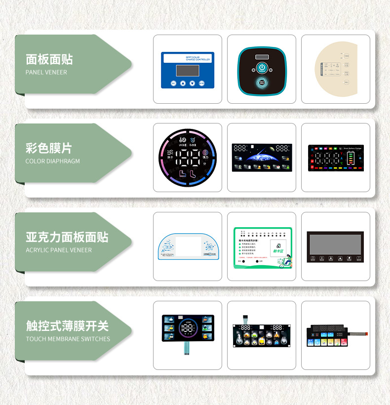可定制各类触控薄膜开关、亚克力面板、鼓包面贴