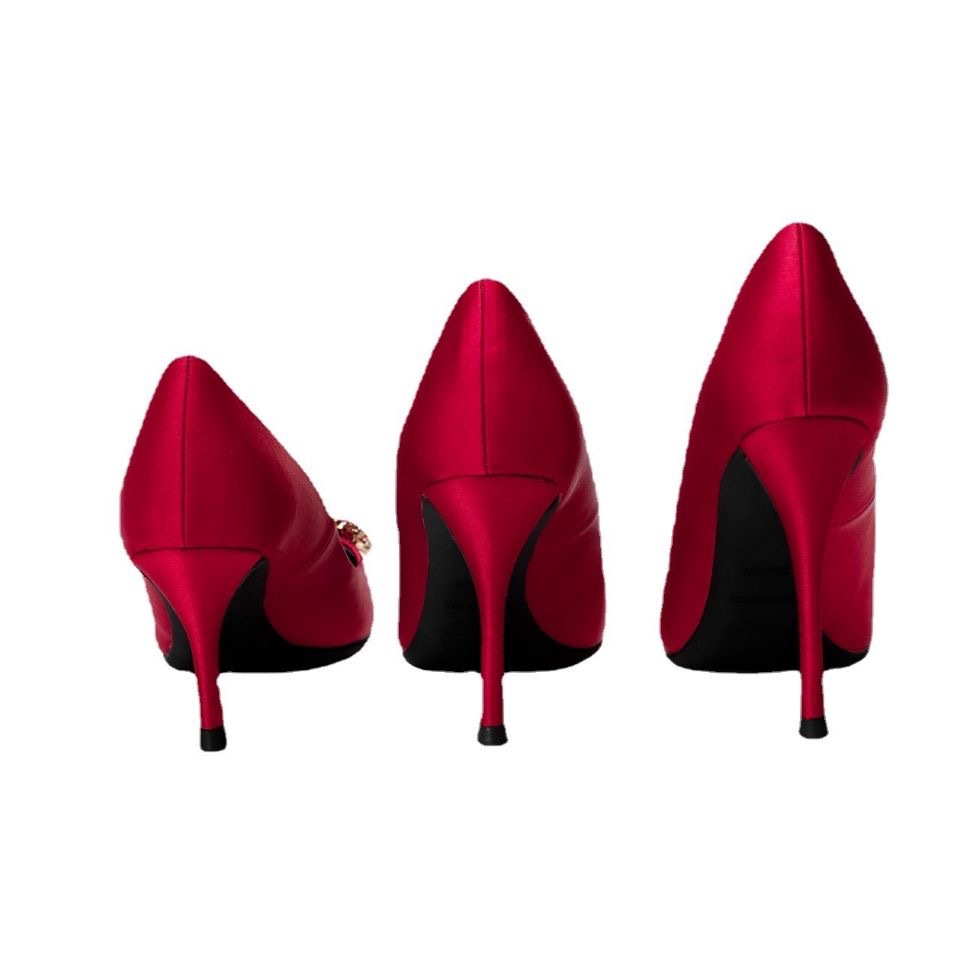 林心如同款RV水钻方扣高跟鞋女细跟尖头平底单鞋绸缎红色婚鞋浅口