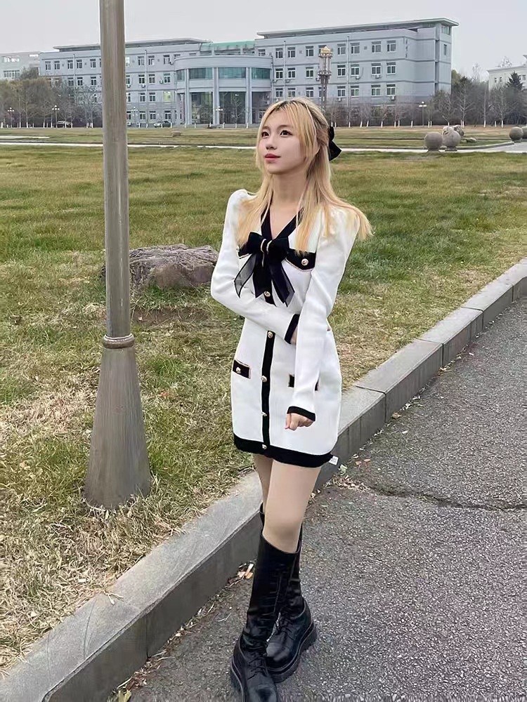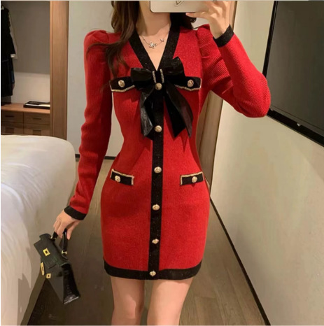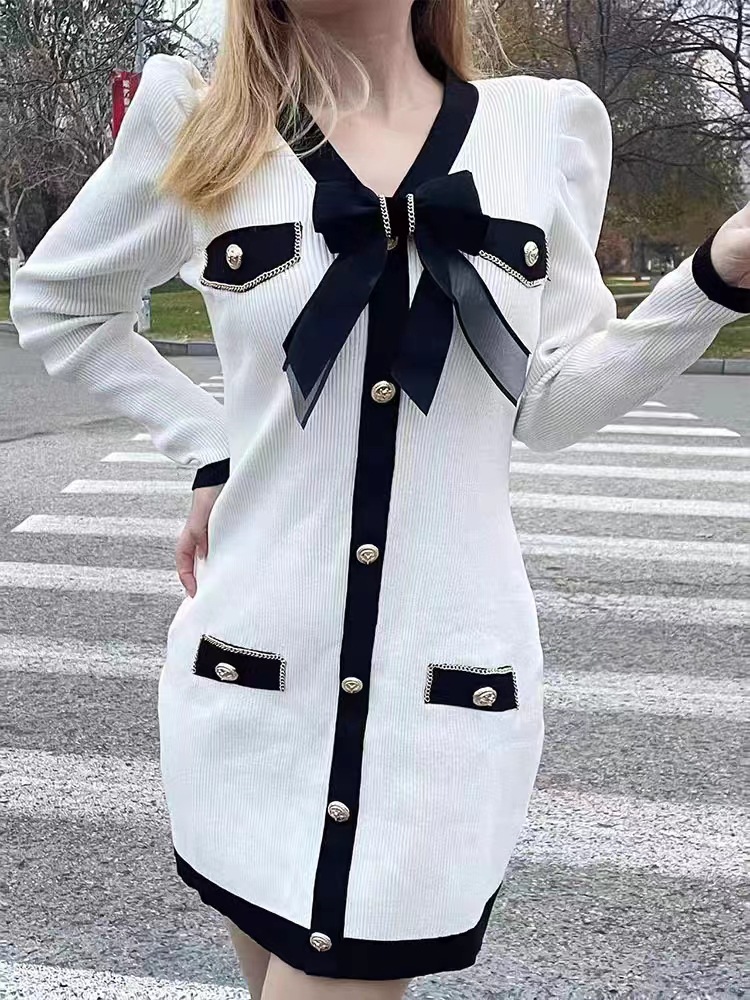小香风秋冬季蝴蝶结V领单排扣修身通勤针织连衣裙名媛口袋拼色