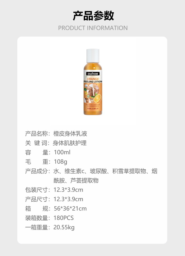 OUHOE 橙皮身体乳液 温和去角质淡化黑斑焕白肌肤滋润肌肤护理液,批发价,价格:6,厂家直销,OUHOE 橙皮身体乳液 温和去角质淡化黑斑焕白肌肤滋润肌肤护理液,免费拿样。