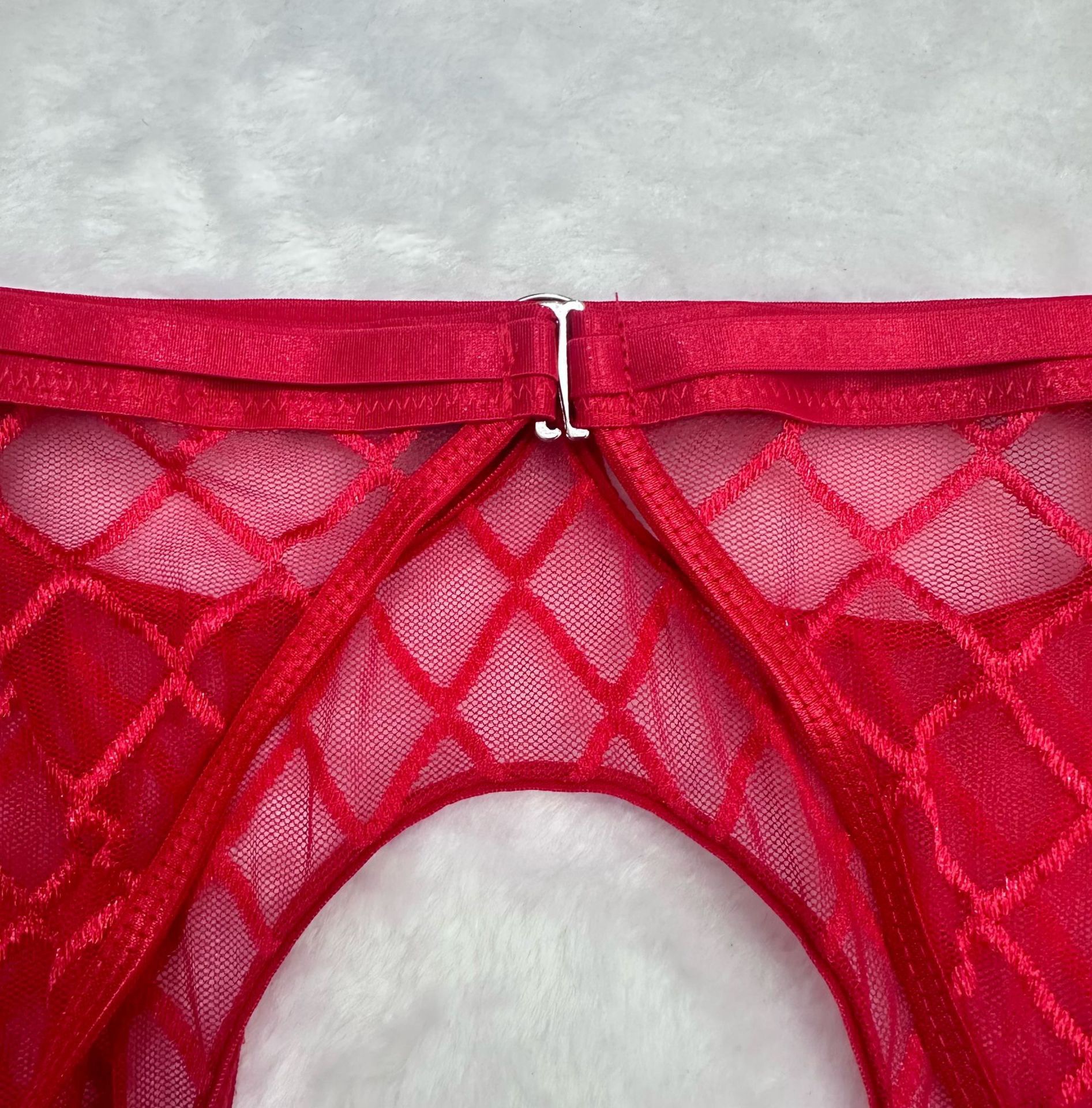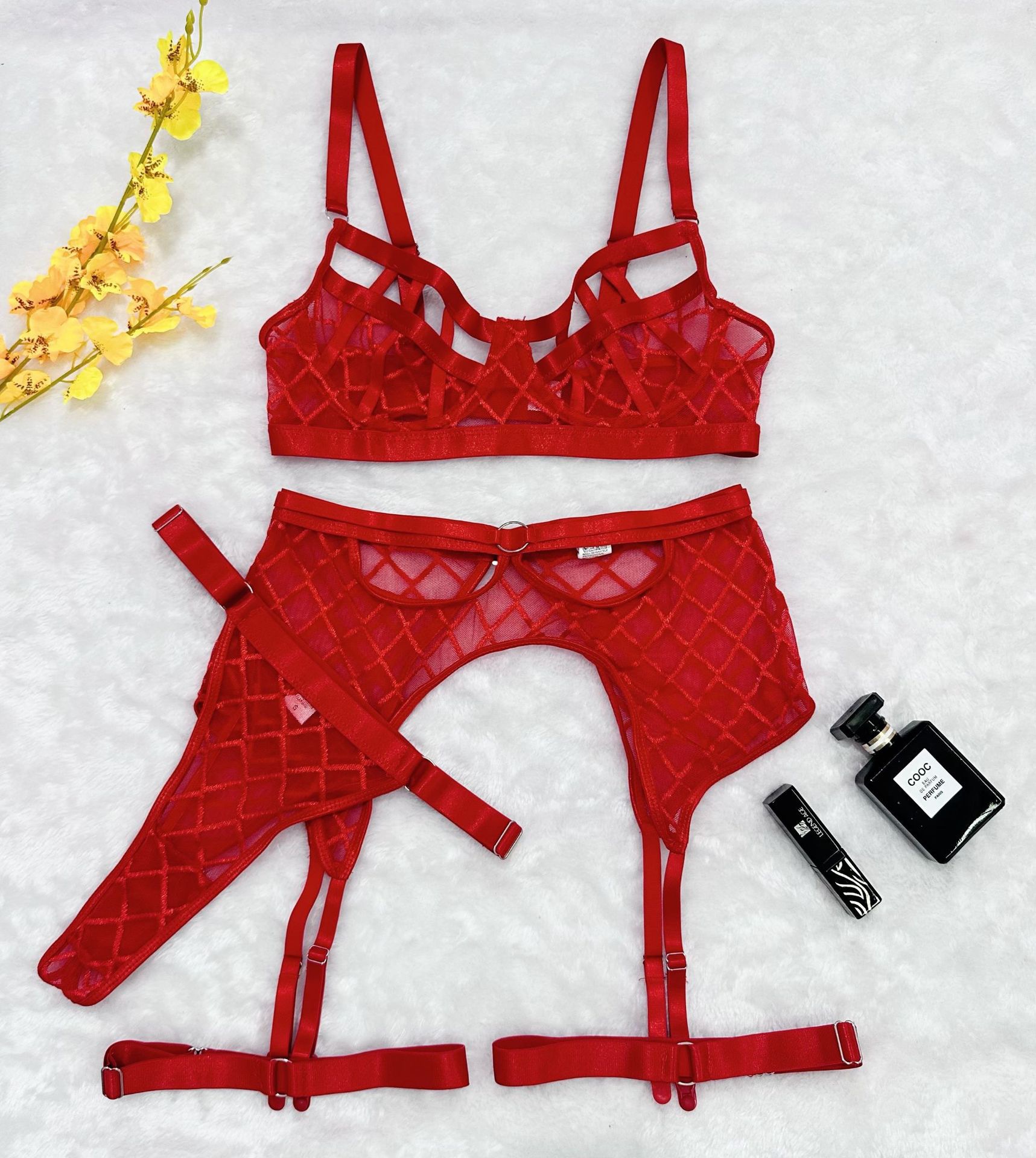 欧美跨境独立站性感网格网纱镂空情趣内衣蕾丝镂空三件套情趣内衣