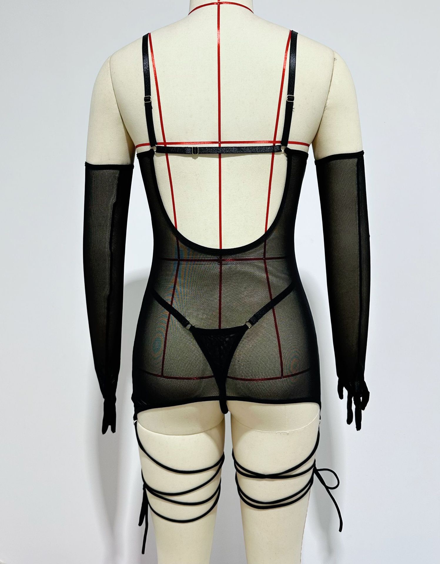 跨境货源欧美性感网纱睡衣配手套丁字裤聚拢钢圈透视情趣内衣套装