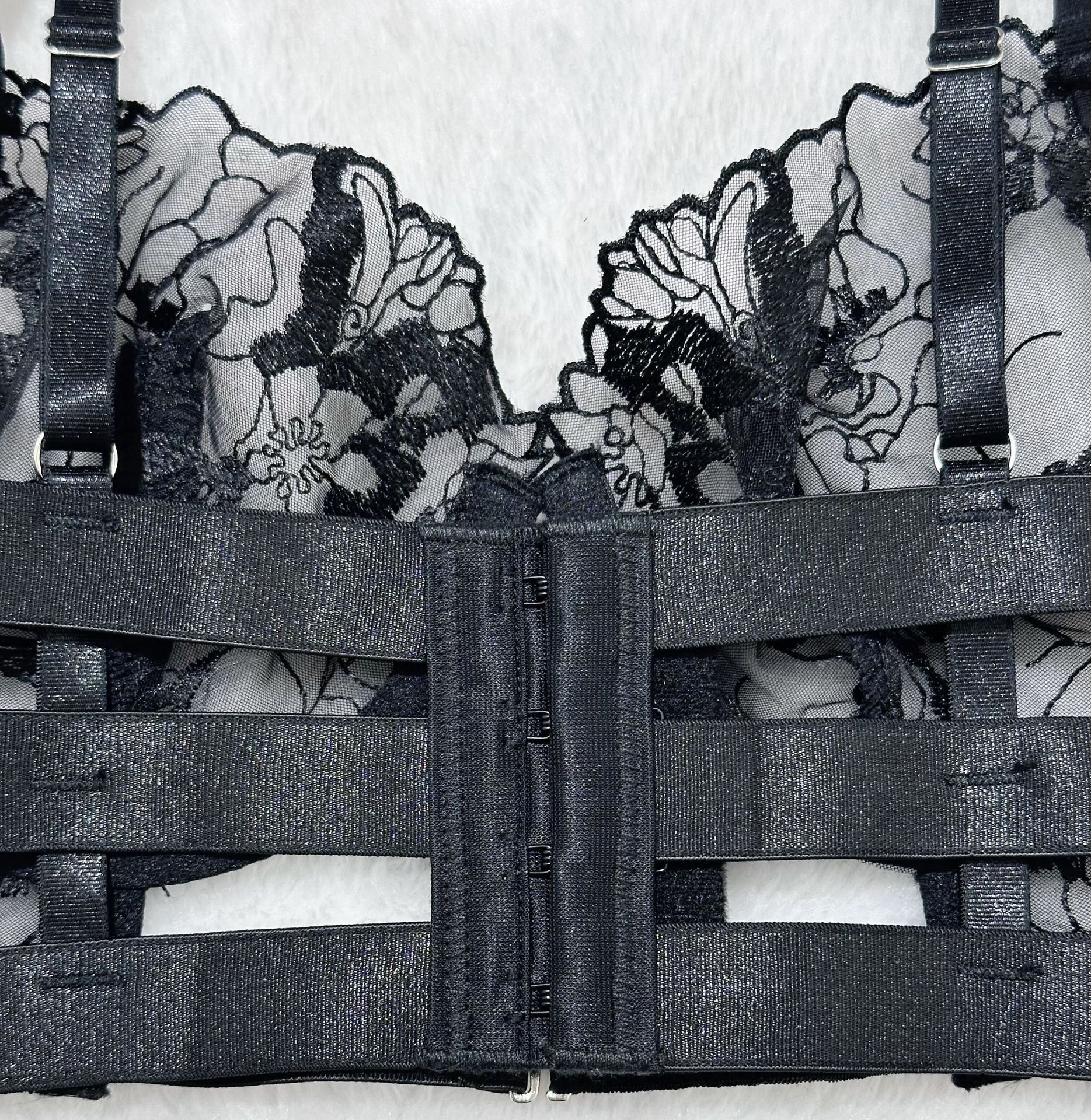 欧美热卖法式性感交叉挂脖刺绣透视网纱拼接情趣内衣内裤四件套女