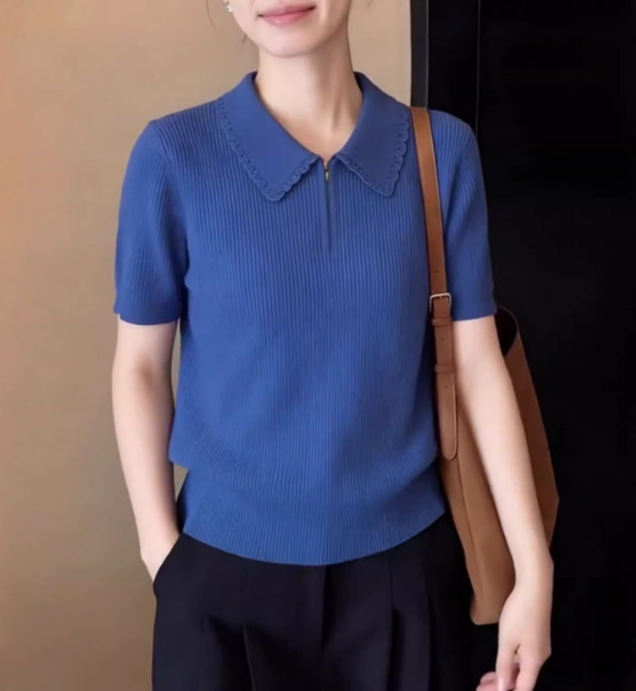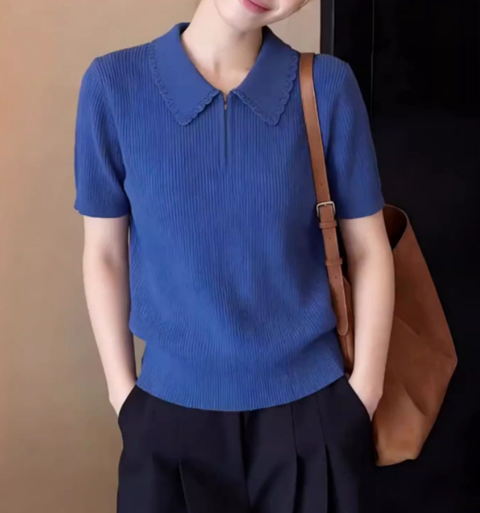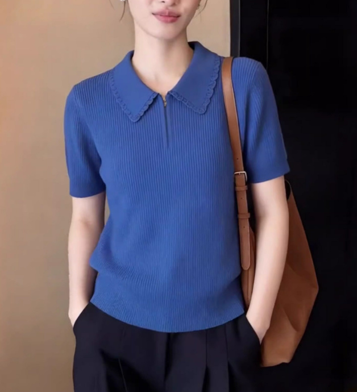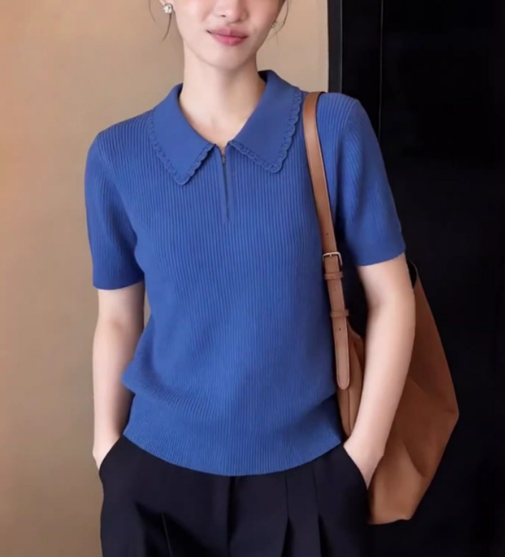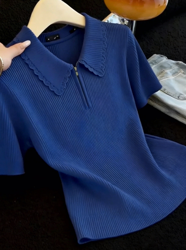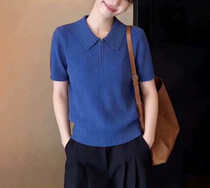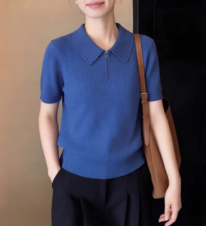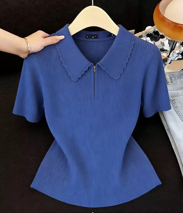 蓝色温柔风精致花边翻领针织T恤女2026夏季新款半拉链大码上衣潮,批发价,价格:39.9,厂家直销,蓝色温柔风精致花边翻领针织T恤女2026夏季新款半拉链大码上衣潮,免费拿样。