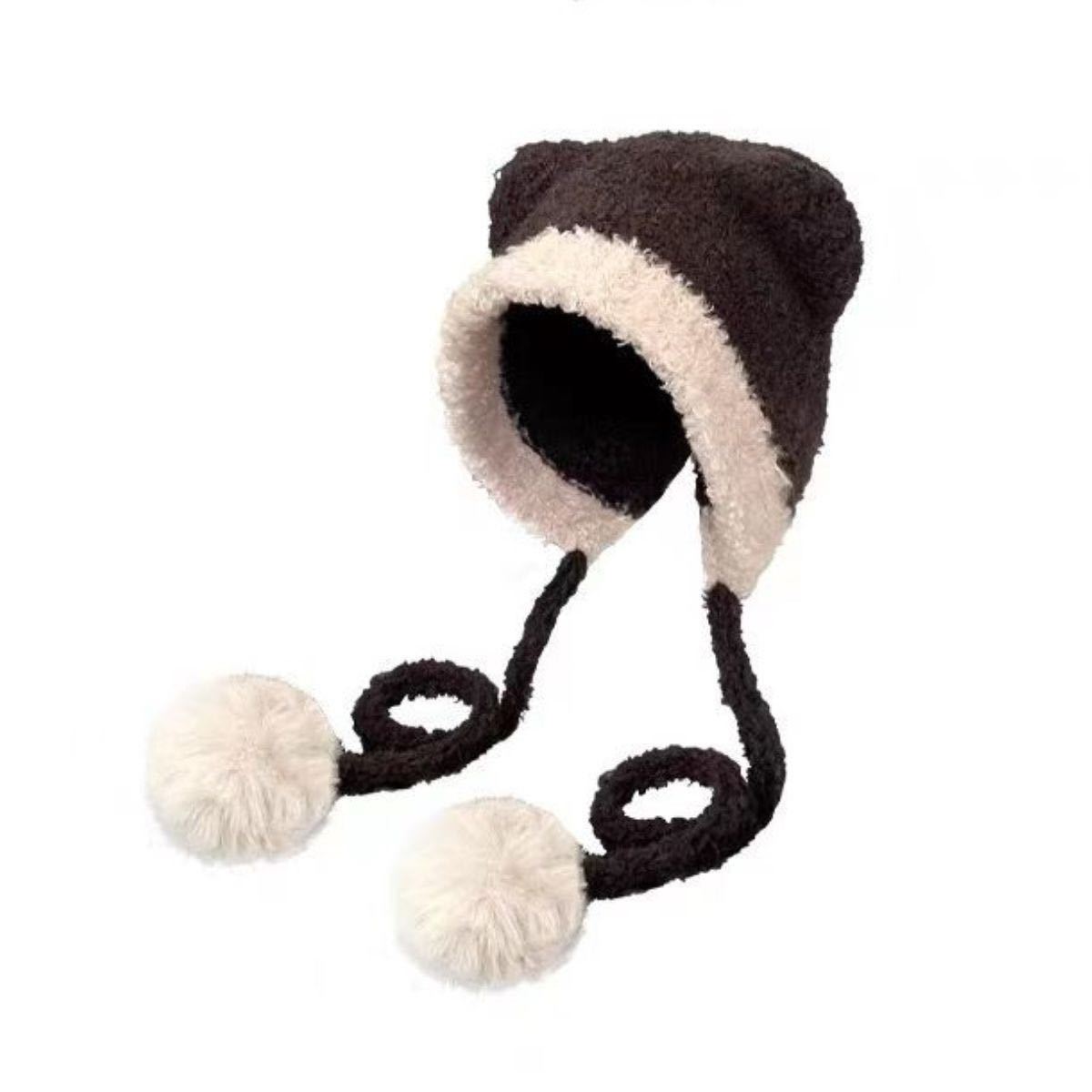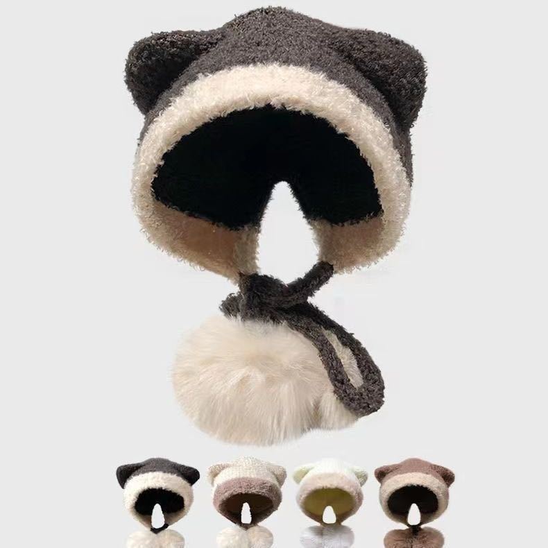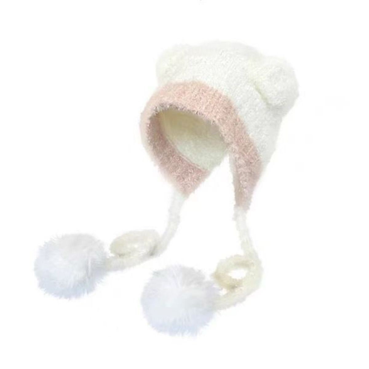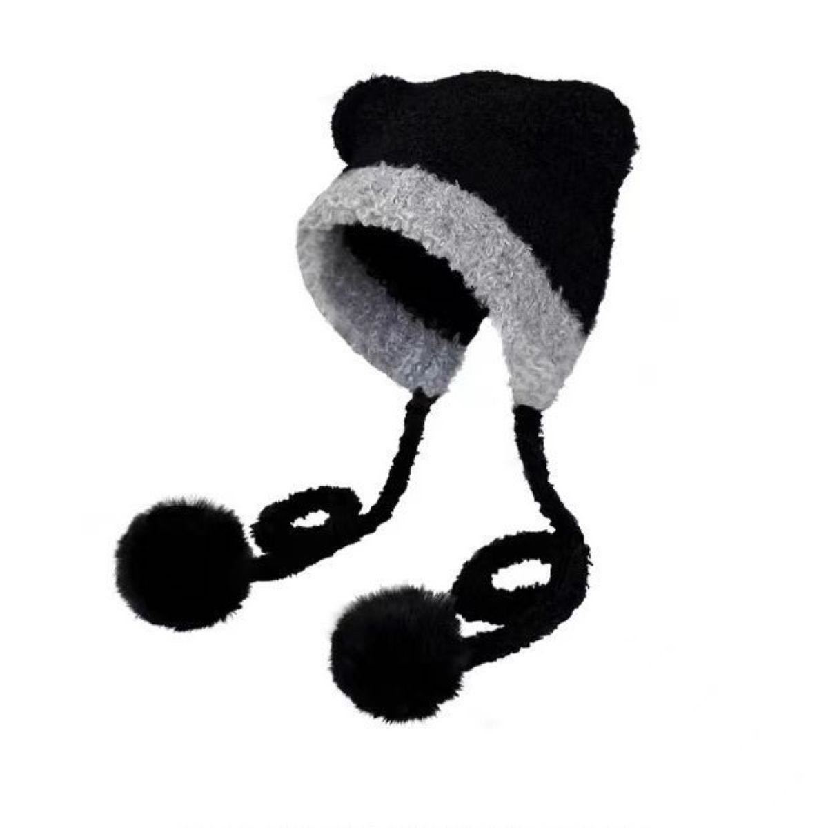 日系可爱冬季小熊拼色耳朵针织绑带雷锋帽子秋冬季保暖护耳毛线帽