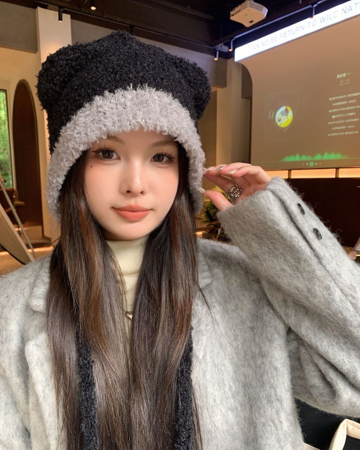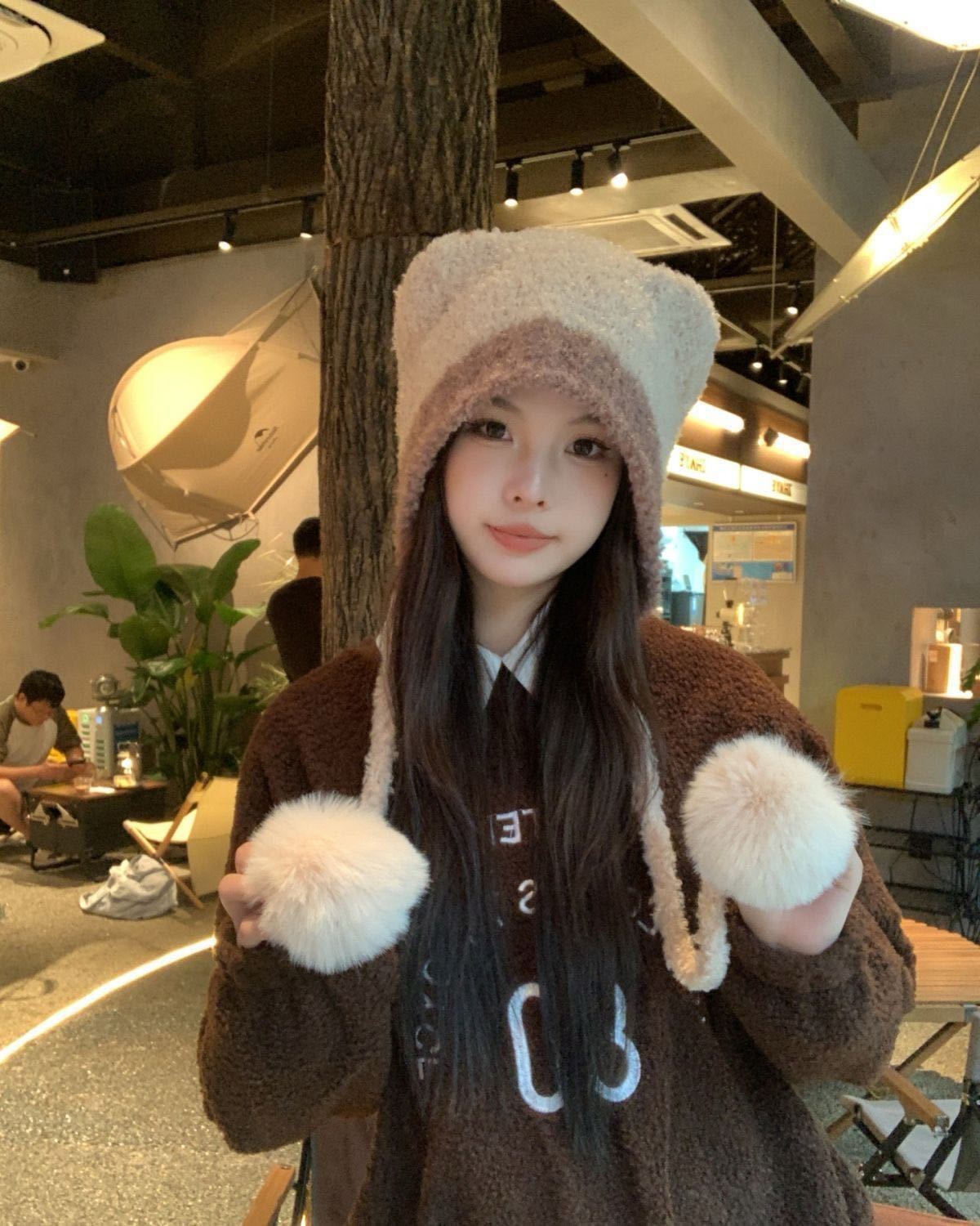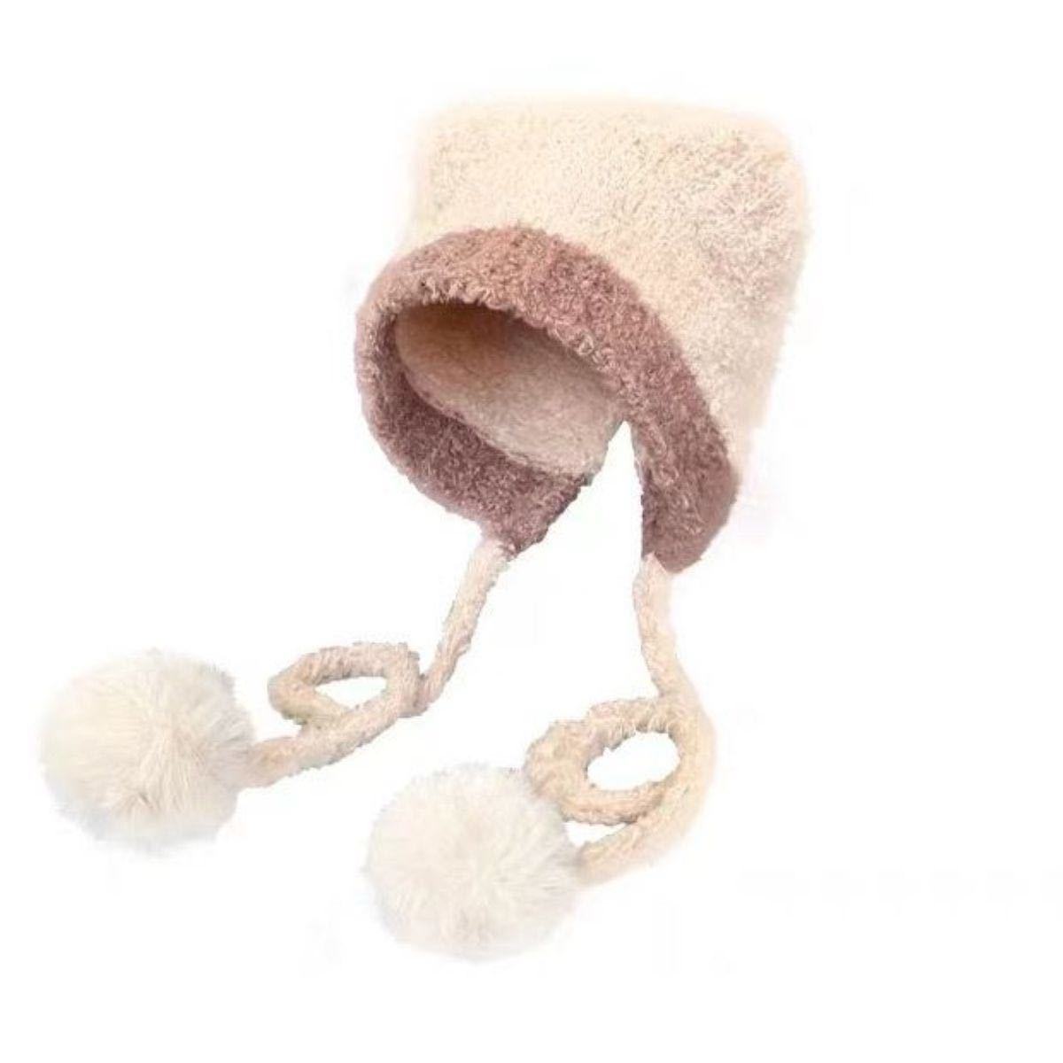 日系可爱冬季小熊拼色耳朵针织绑带雷锋帽子秋冬季保暖护耳毛线帽