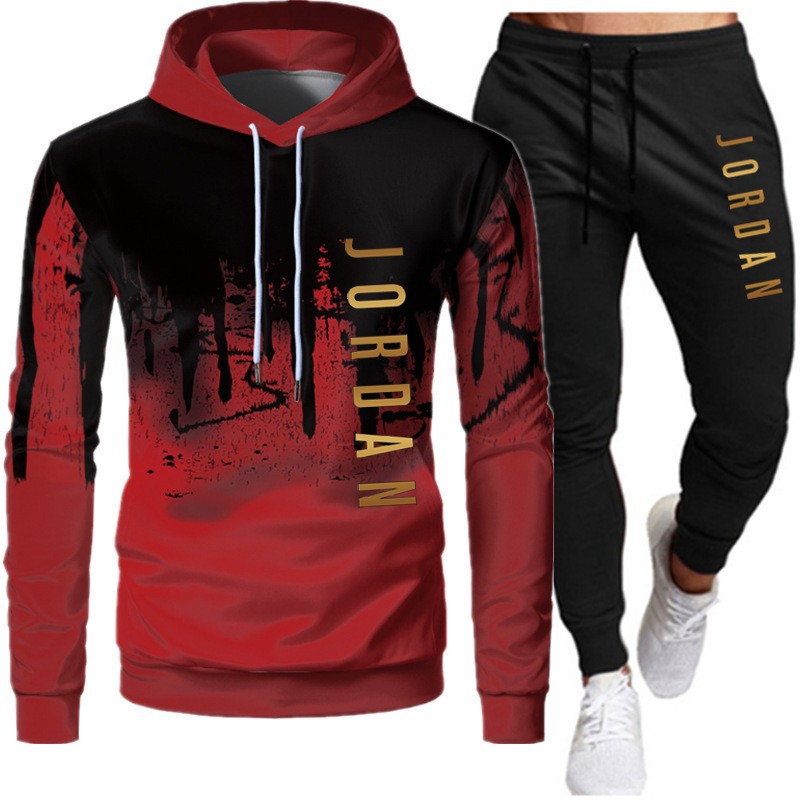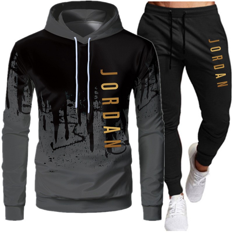 跨境新款男装春秋季欧美印花连帽男加绒休闲卫衣套装