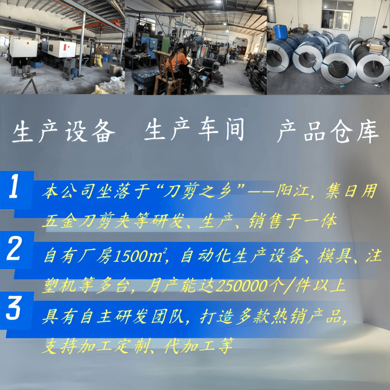 阳江市阳东区金朋五金厂,坐落于刀剪之乡---阳江,是一家专业集研发,生产,包装,销售,售后为一体的五金厂,只要产品有,美容工具、修甲工具等。生产模式让我们在众多优秀竞争者中崭露头角,获得许多顾客一致好评,欢迎国内外客户来样洽谈。我们是私人厂房,拥有完善的设备,液压机、冲床、线切割等机械。我们本着:质量为本,顾客至上,诚实守信“的服务宗旨,您的支持是我们莫大的动力,我们期待与您携手共赢。