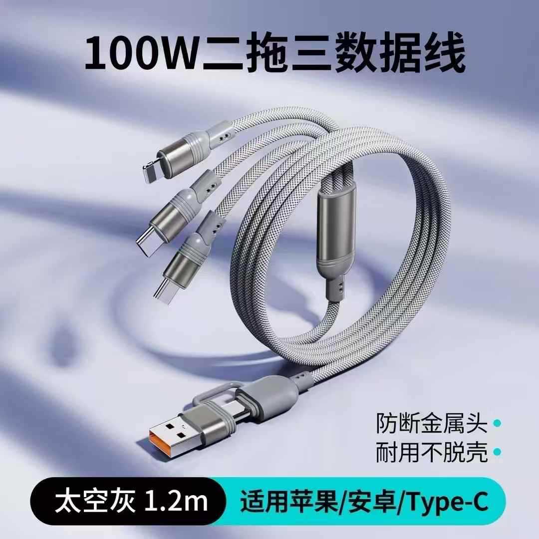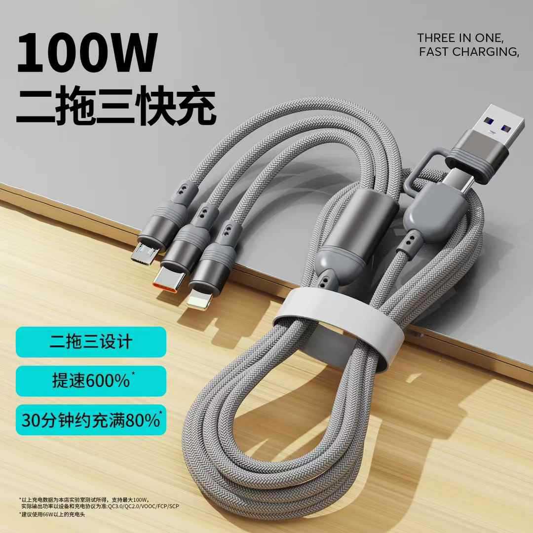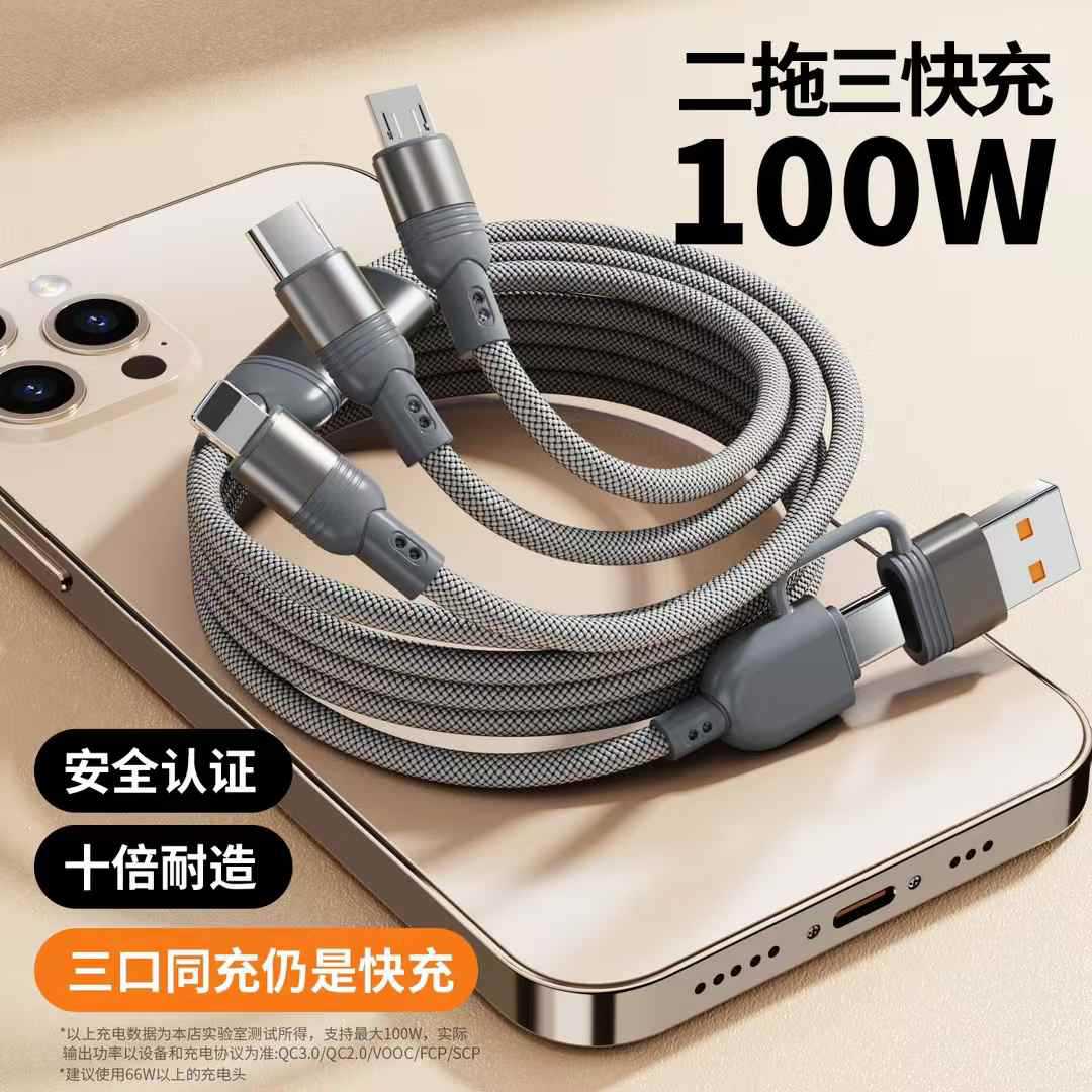 二拖三快充100W编织数据线适用安卓Type-c苹果华为超级快充充电线