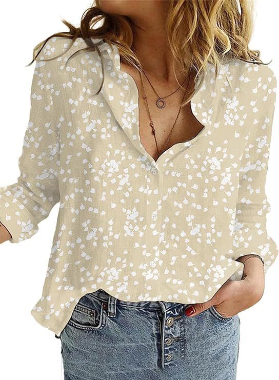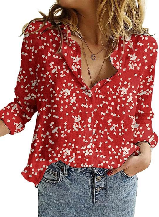 女式休闲开领花卉印花卷袖长袖雪纺系扣衬衫波西米亚上衣