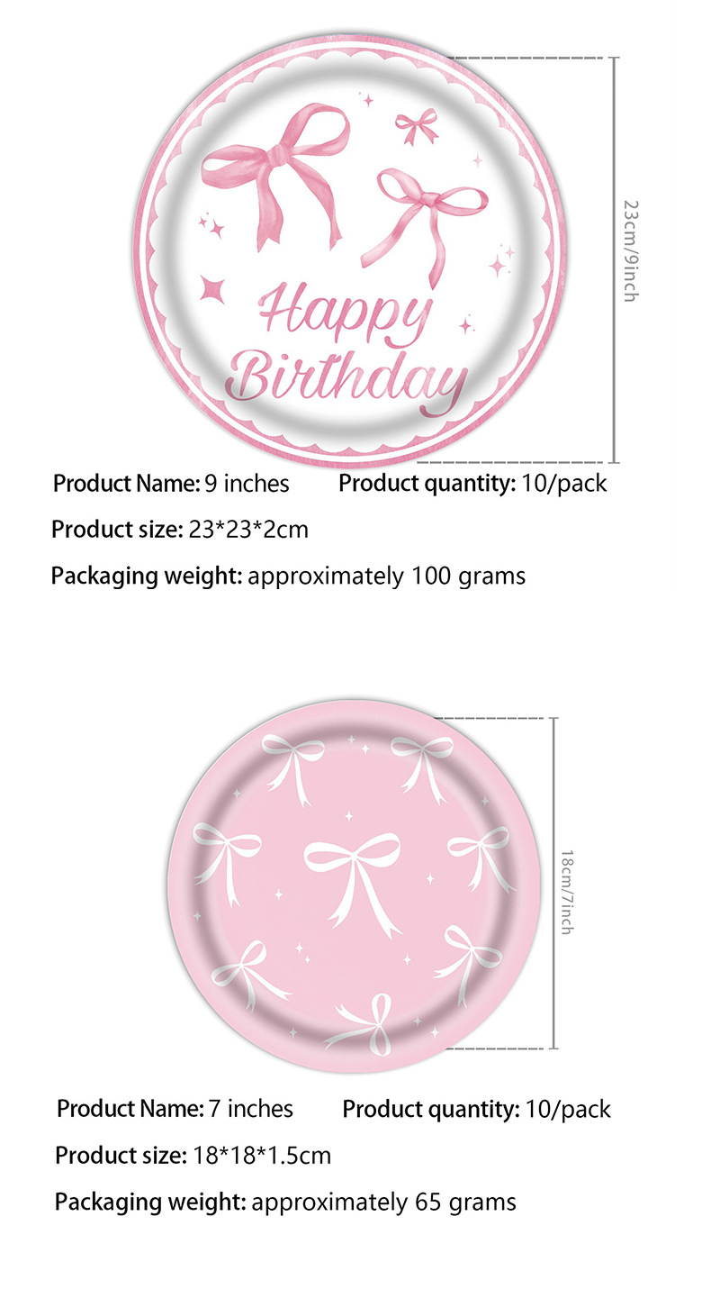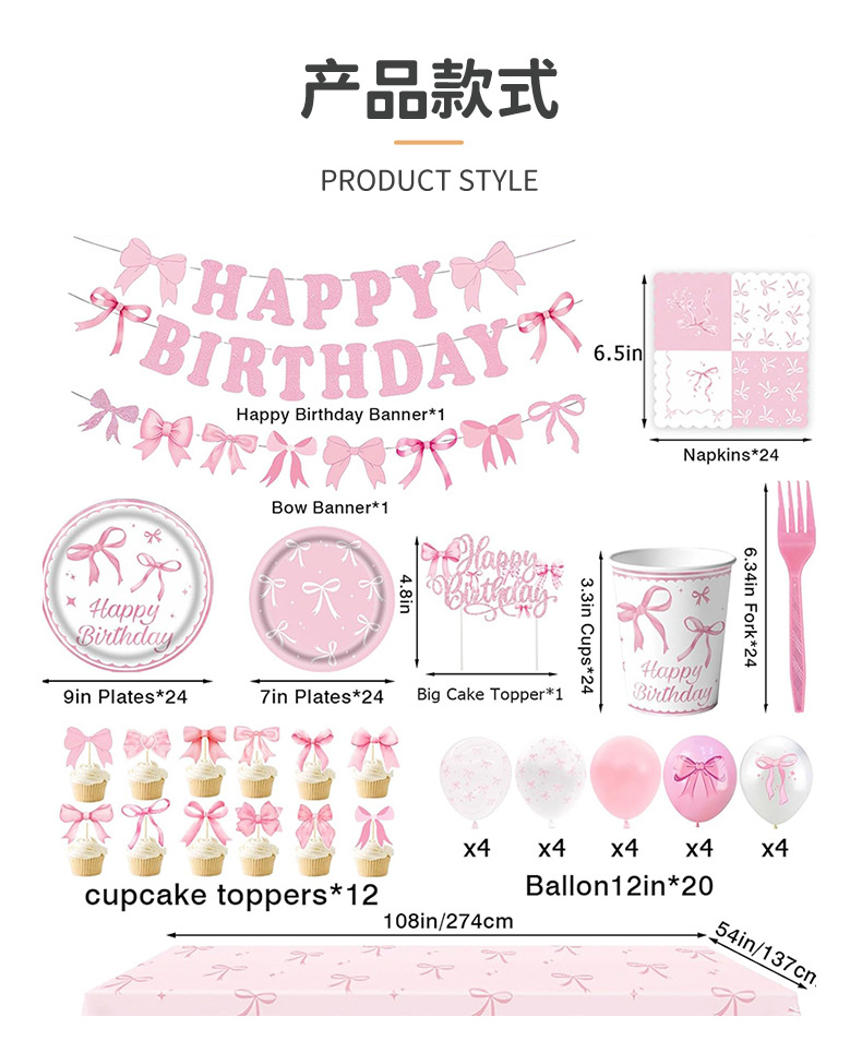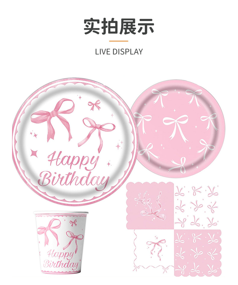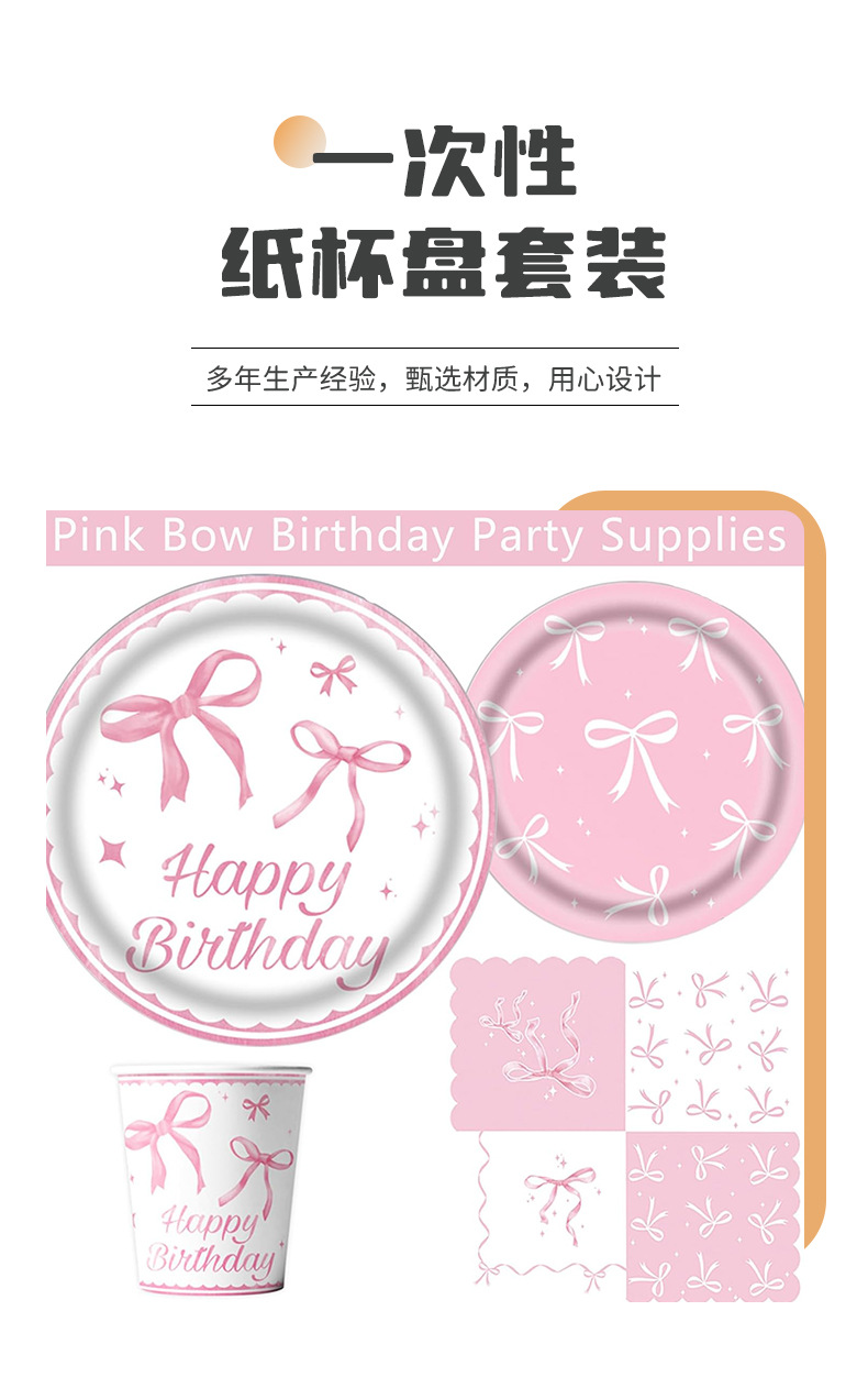 粉色蝴蝶结生日布置一次性纸盘纸杯桌布拉旗横幅气球女孩庆生餐具