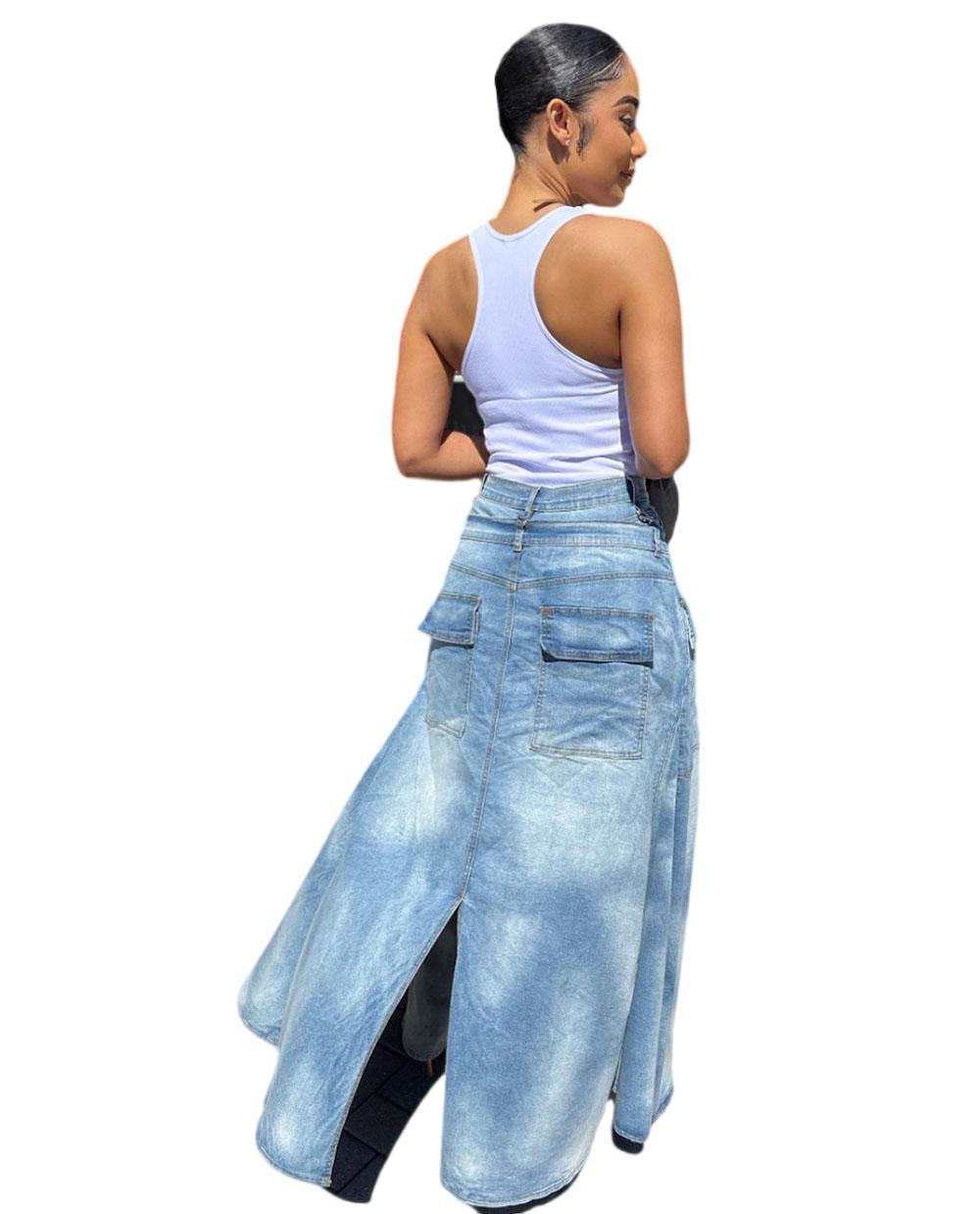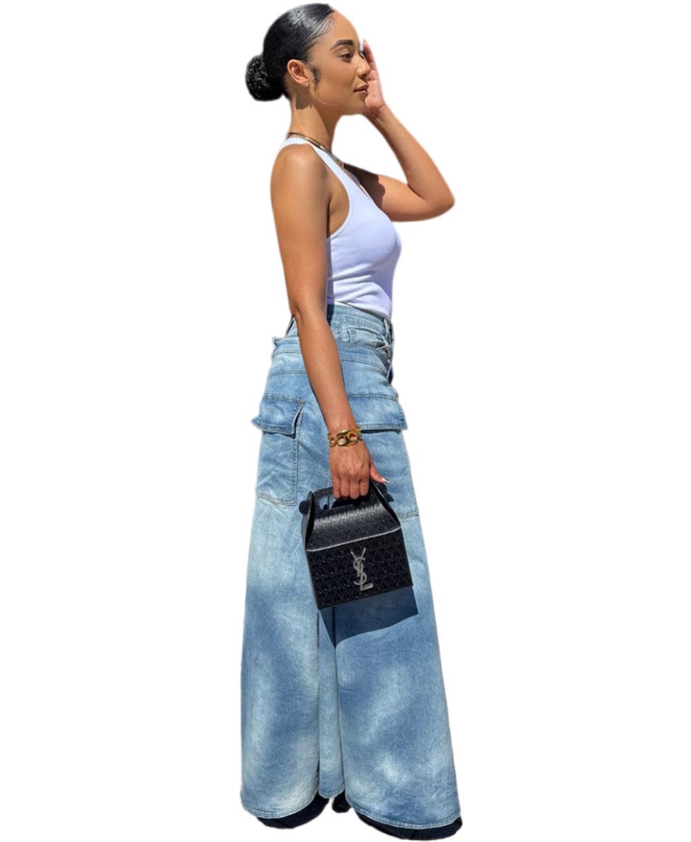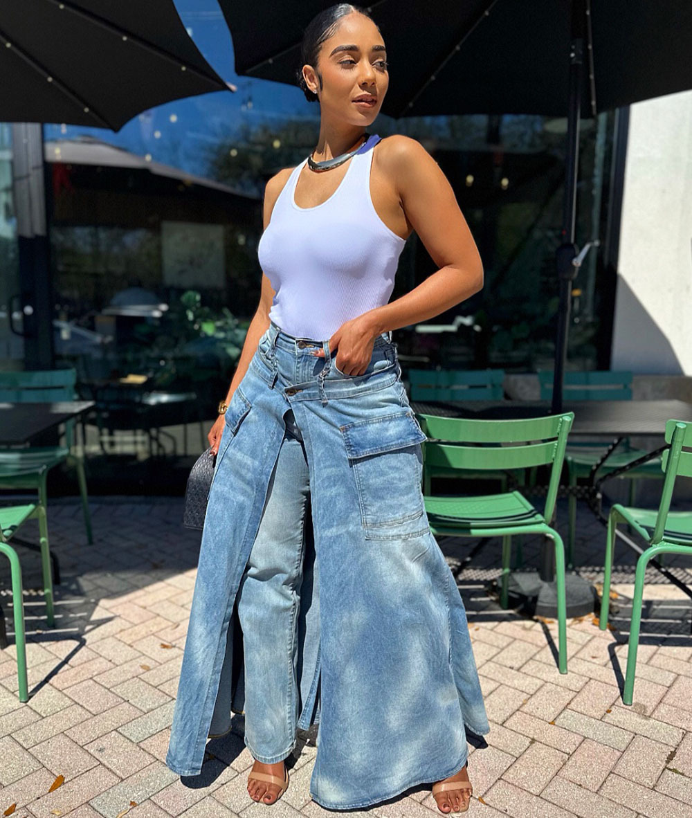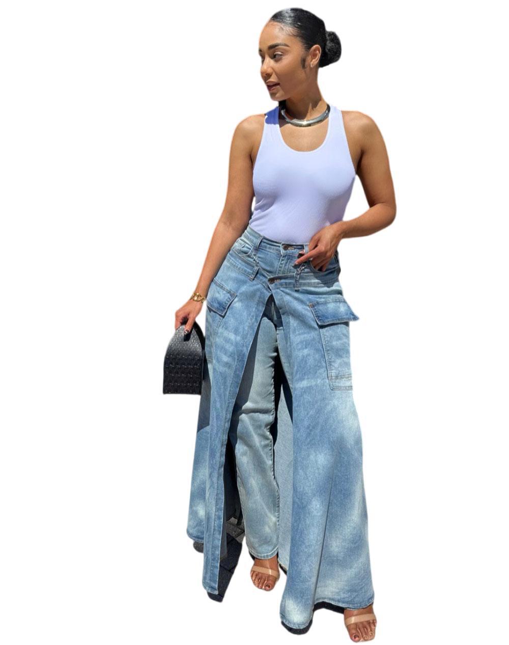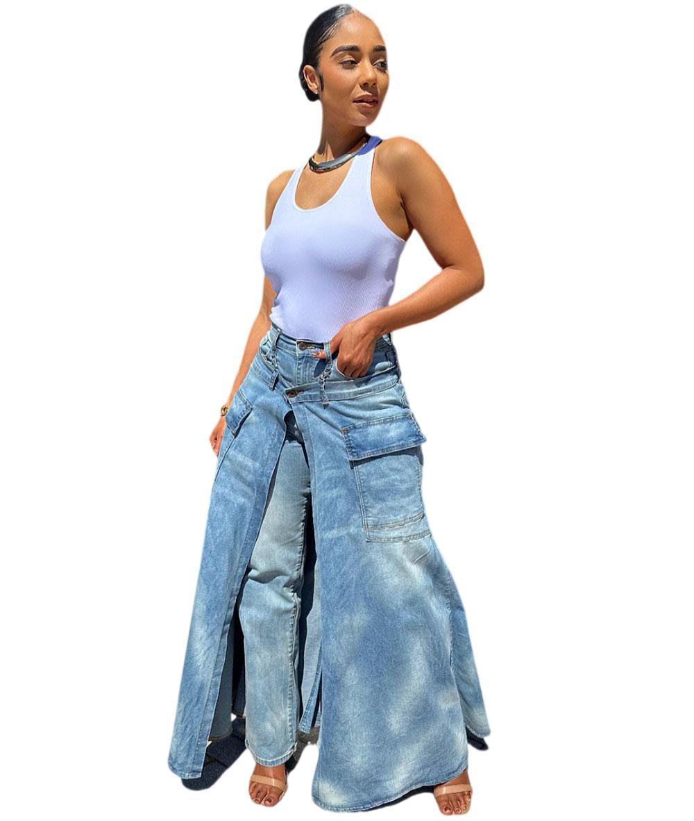 欧美女式假两件牛仔裤裙 亚马逊跨境女装街头潮流对称开衩牛仔裤