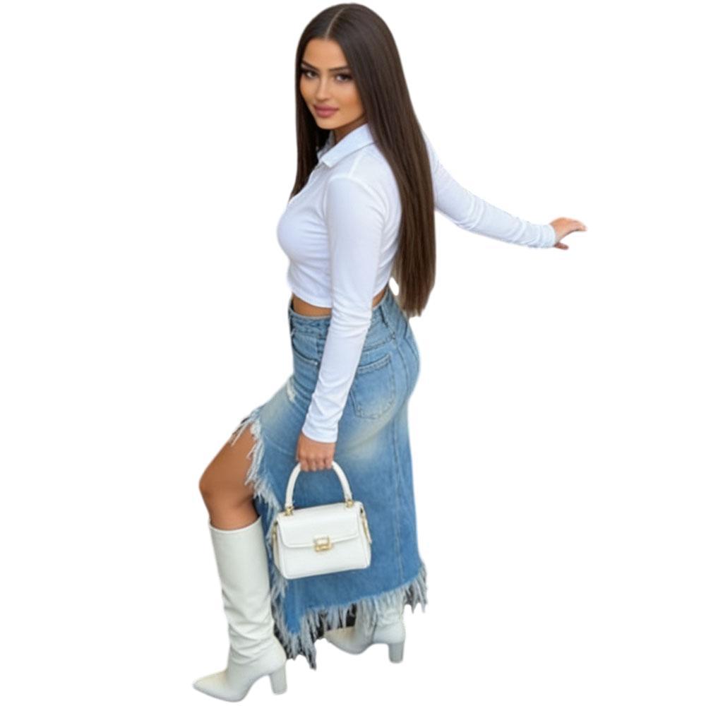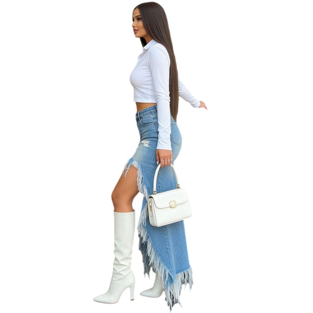 欧美ins风不规则毛边牛仔半身裙亚马逊跨境女装时尚开叉流苏长裙