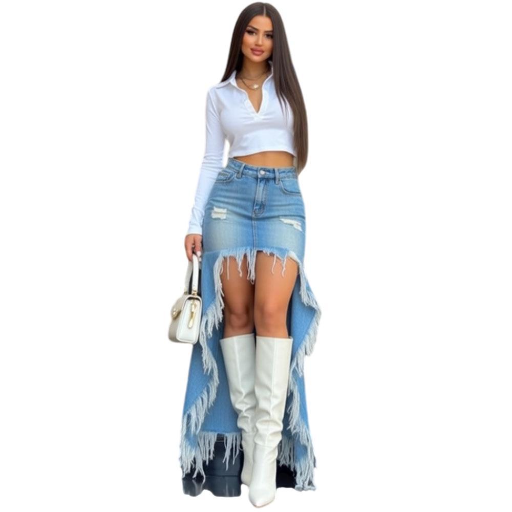 欧美ins风不规则毛边牛仔半身裙亚马逊跨境女装时尚开叉流苏长裙,批发价,价格:63,厂家直销,欧美ins风不规则毛边牛仔半身裙亚马逊跨境女装时尚开叉流苏长裙,免费拿样。
