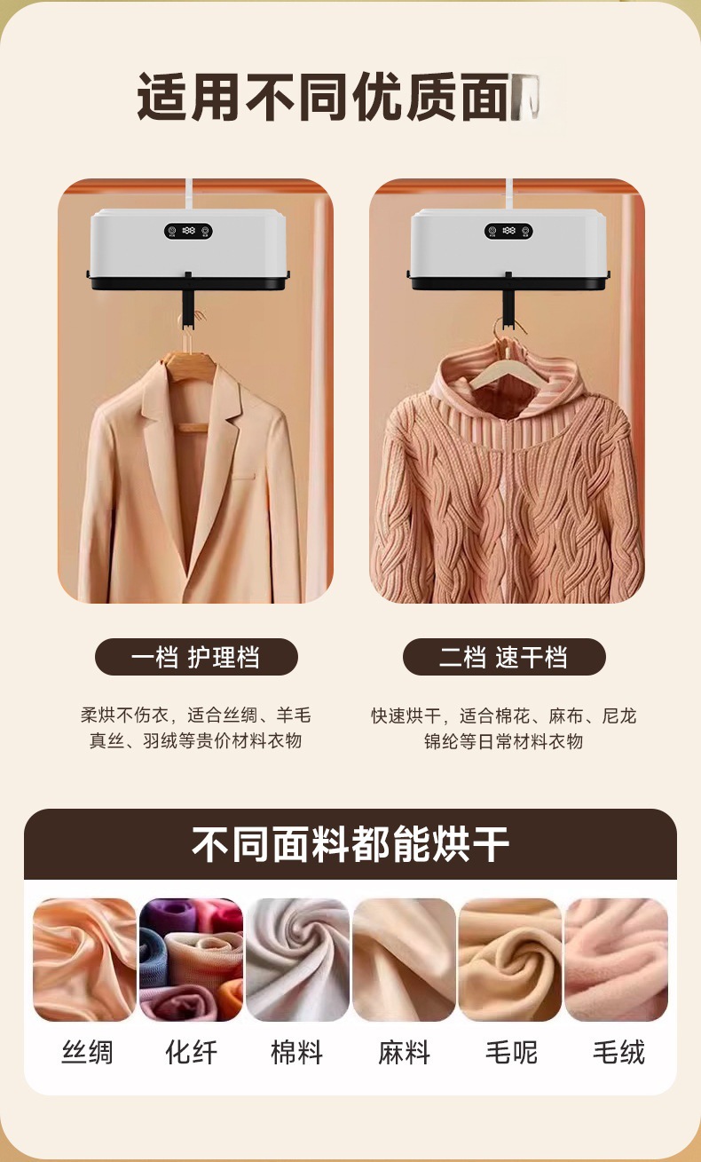 推荐理由:迷你烘衣“小太阳”,焕新衣物快又强。阴雨天晾衣久?出差洗衣干不了?这款小型烘衣机来救场!精致身形不占地,挂起即用超便捷。强劲烘干力,快速驱散潮气,让衣物如沐阳光般干爽蓬松。智能定时更省心,告别久烘