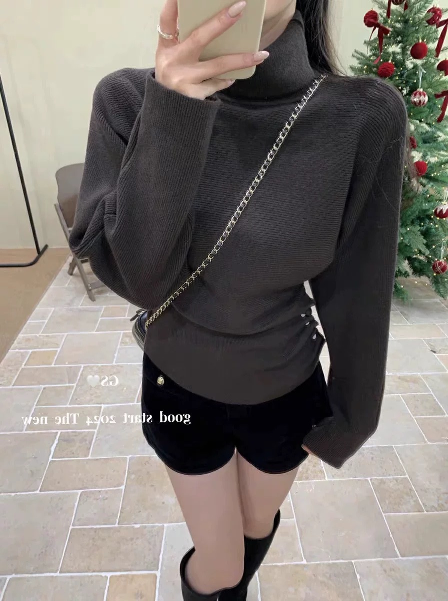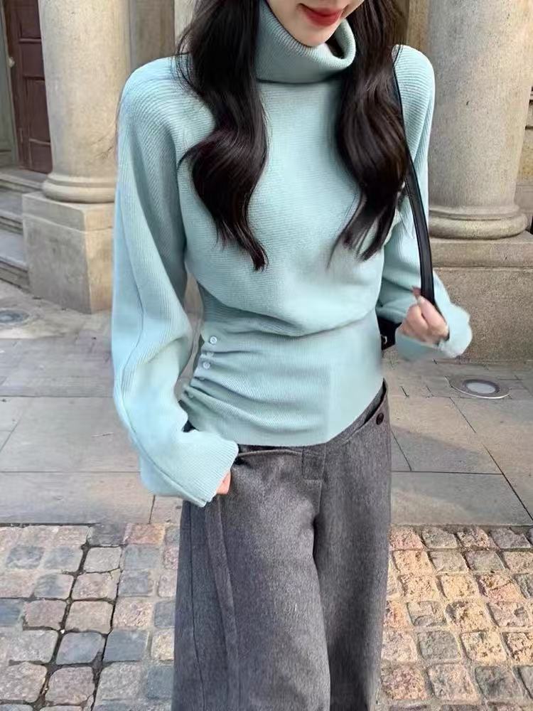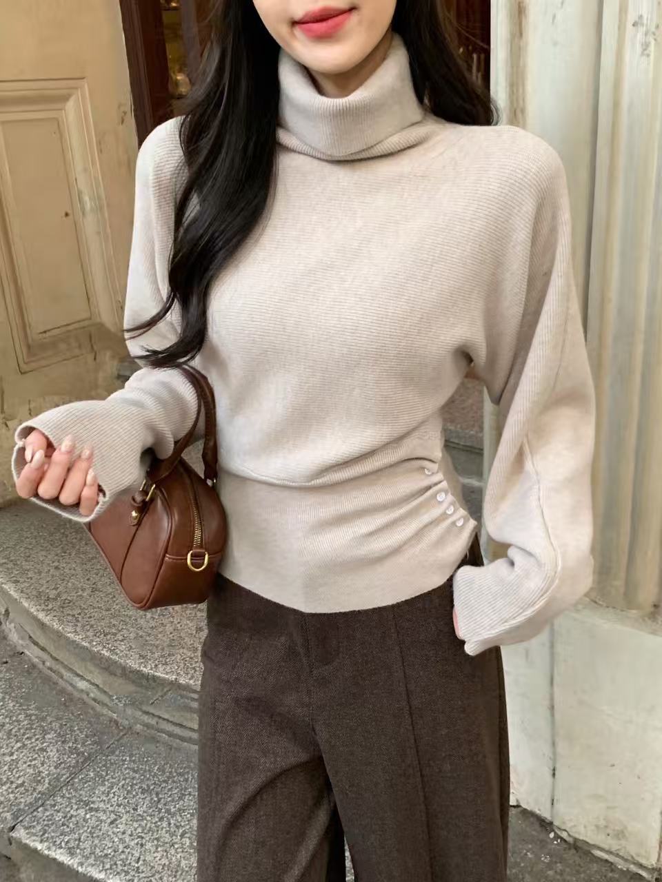 高领侧边抽褶设计感针织衫女秋冬内搭收腰显瘦气质上衣25时尚新款