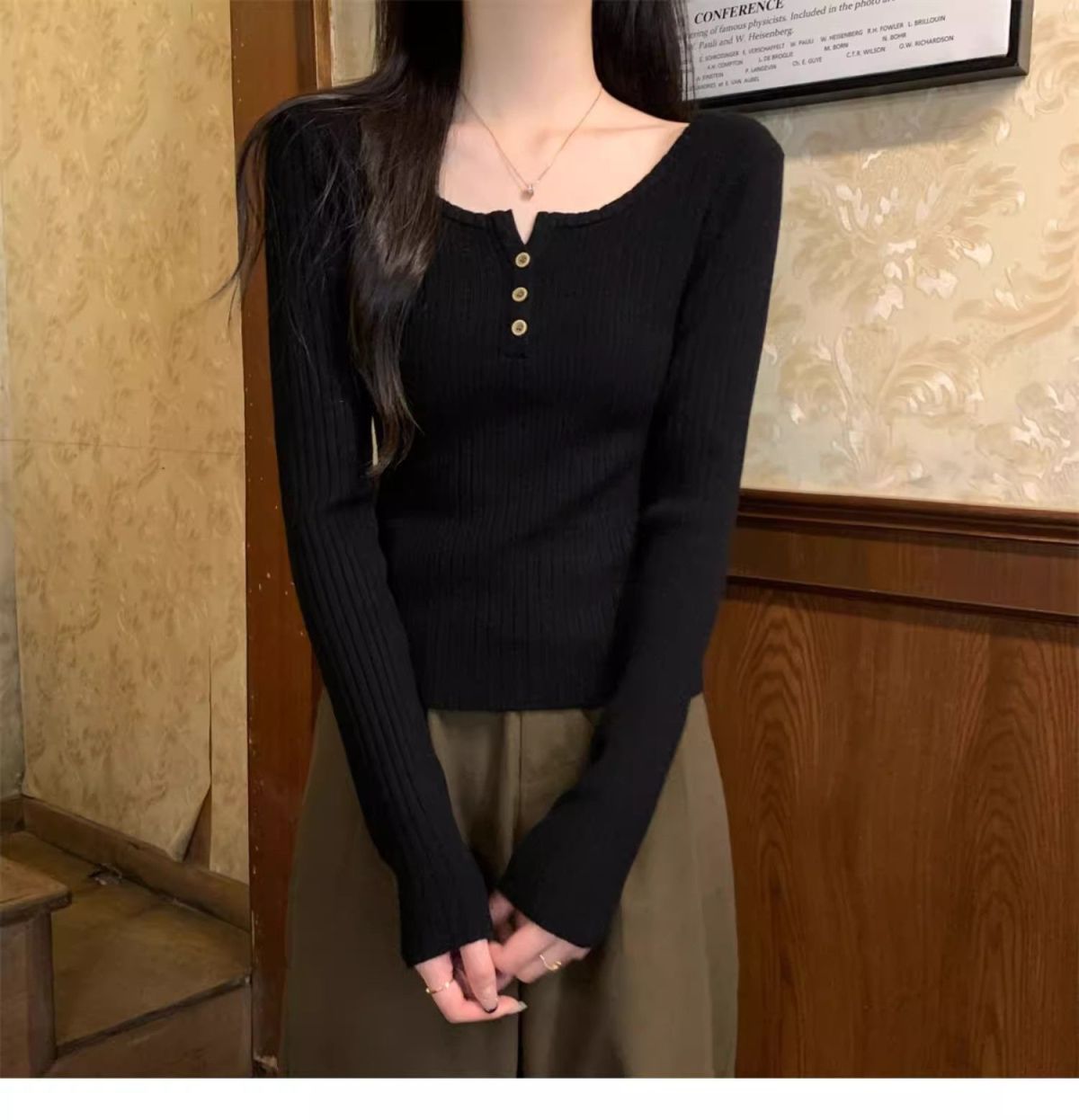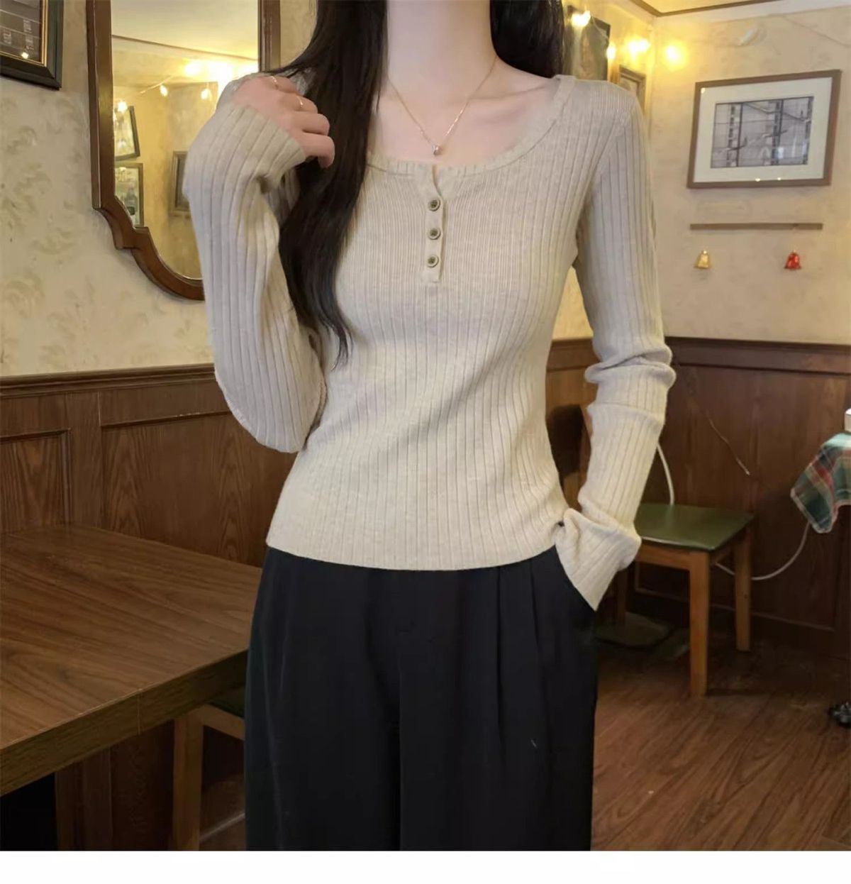秋冬法式方领针织毛衣女 别致纽扣 纯欲修身 内搭打底款