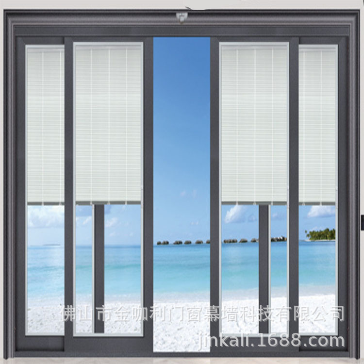 铝合金推拉门 三轨带纱门 中空钢化玻璃 内置磁控百叶
