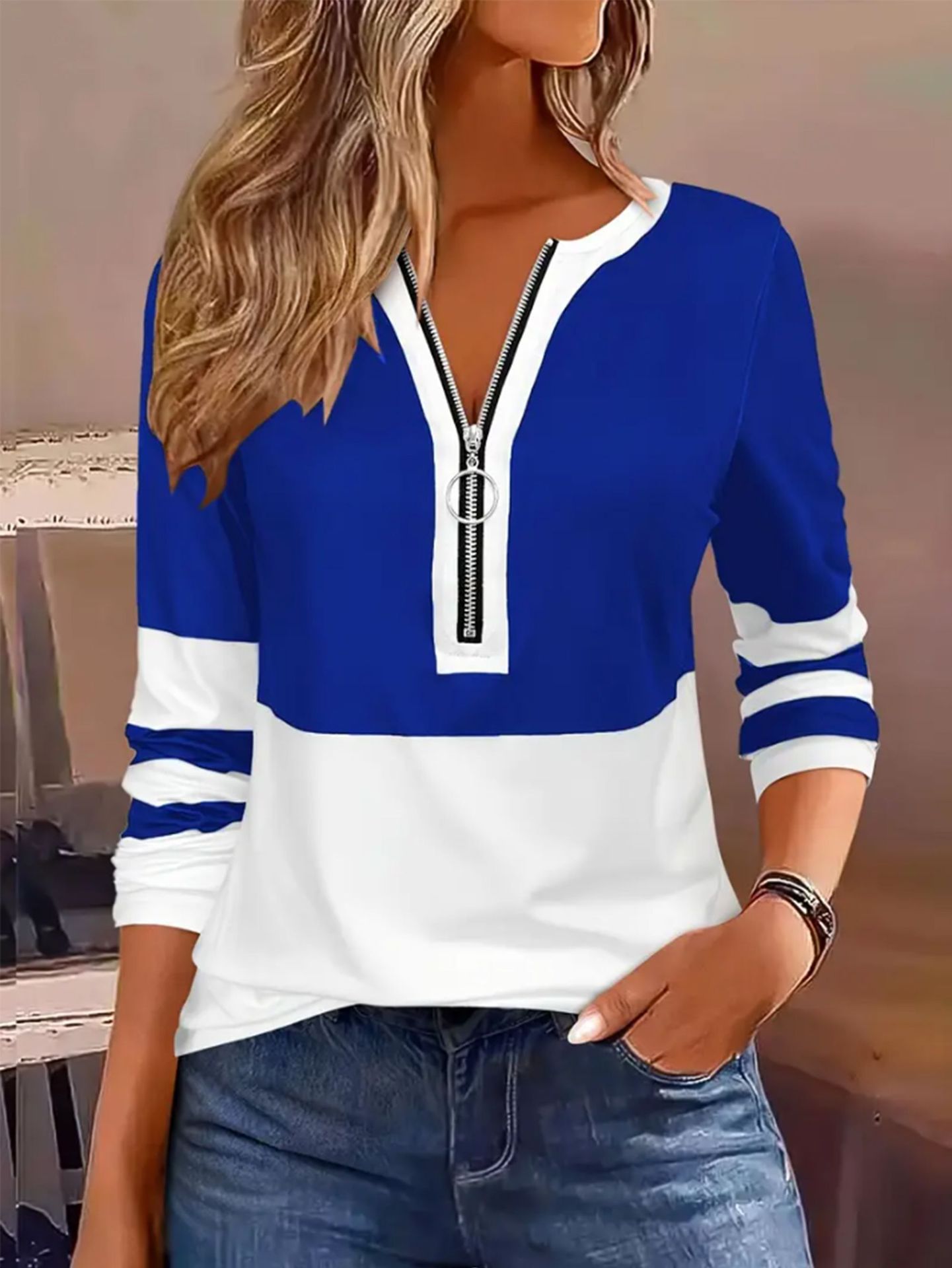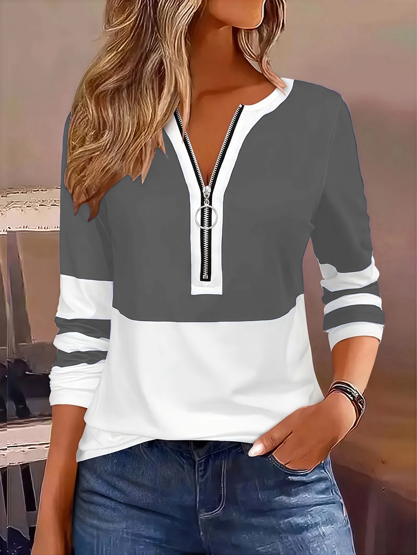 25秋欧美外贸速卖通亚马逊货源拉链休闲女装长袖T恤