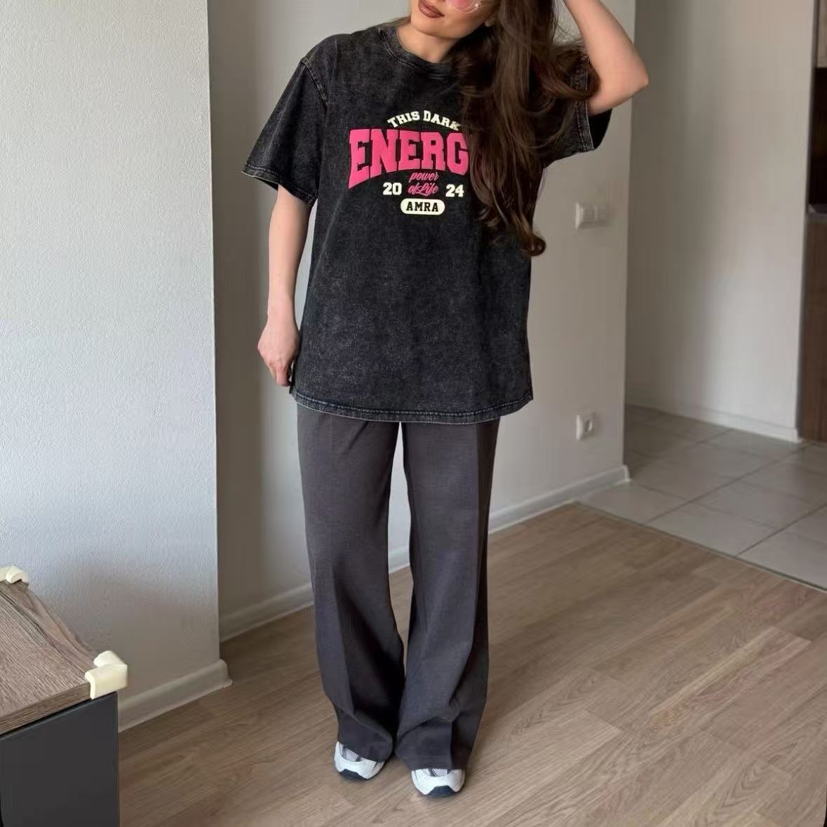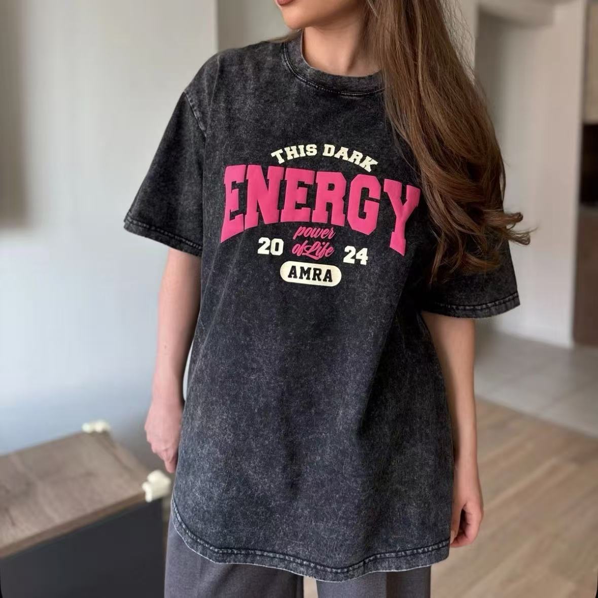 欧美hiphop潮牌做旧短袖t恤女大码宽松oversize水洗黑印花上衣服