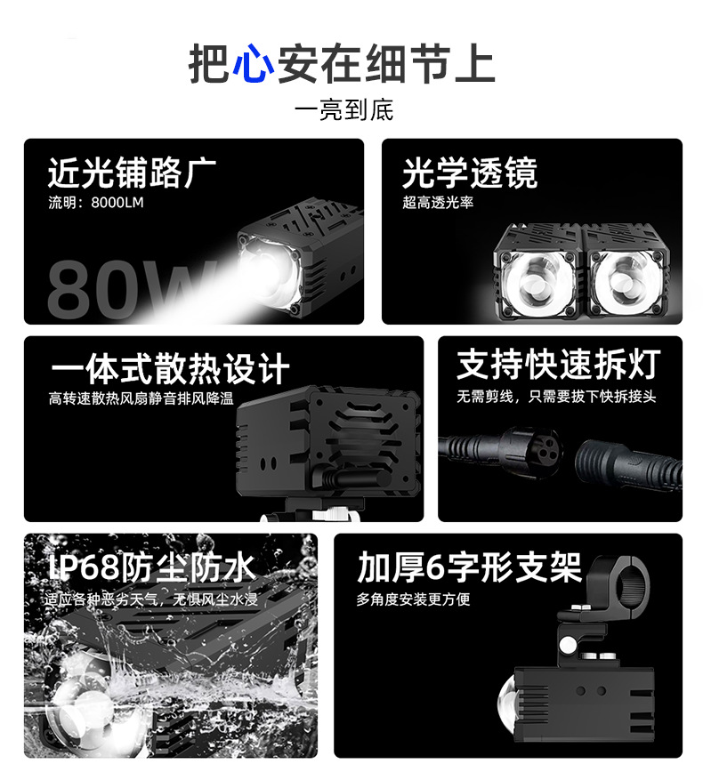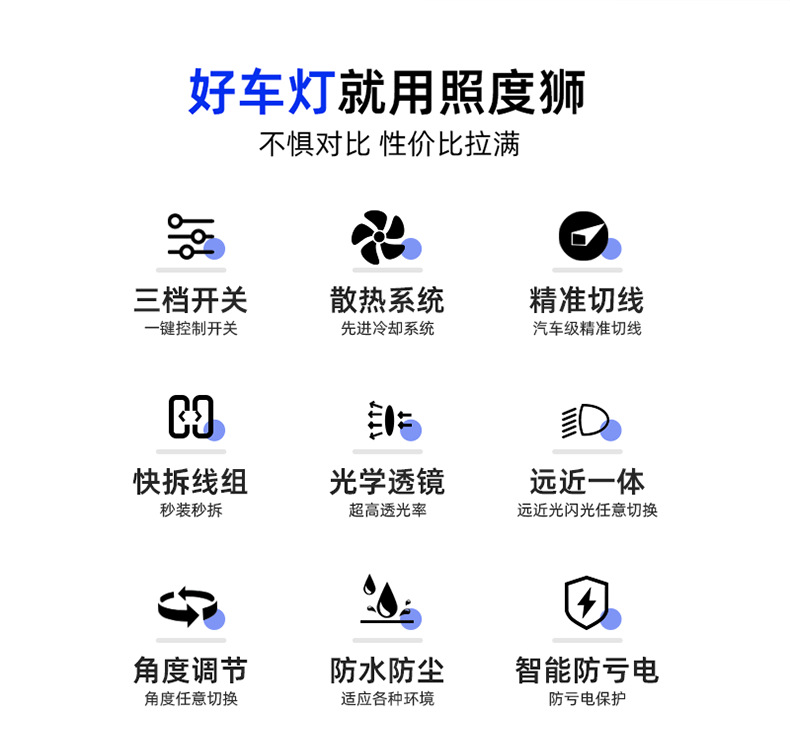 推荐理由:新款LED车灯,超亮聚光,激光灯珠,铺路宽,切线清晰,合规生产,不晃眼,低功耗,IP68防水处理,智能温控,静音风扇,年审无忧