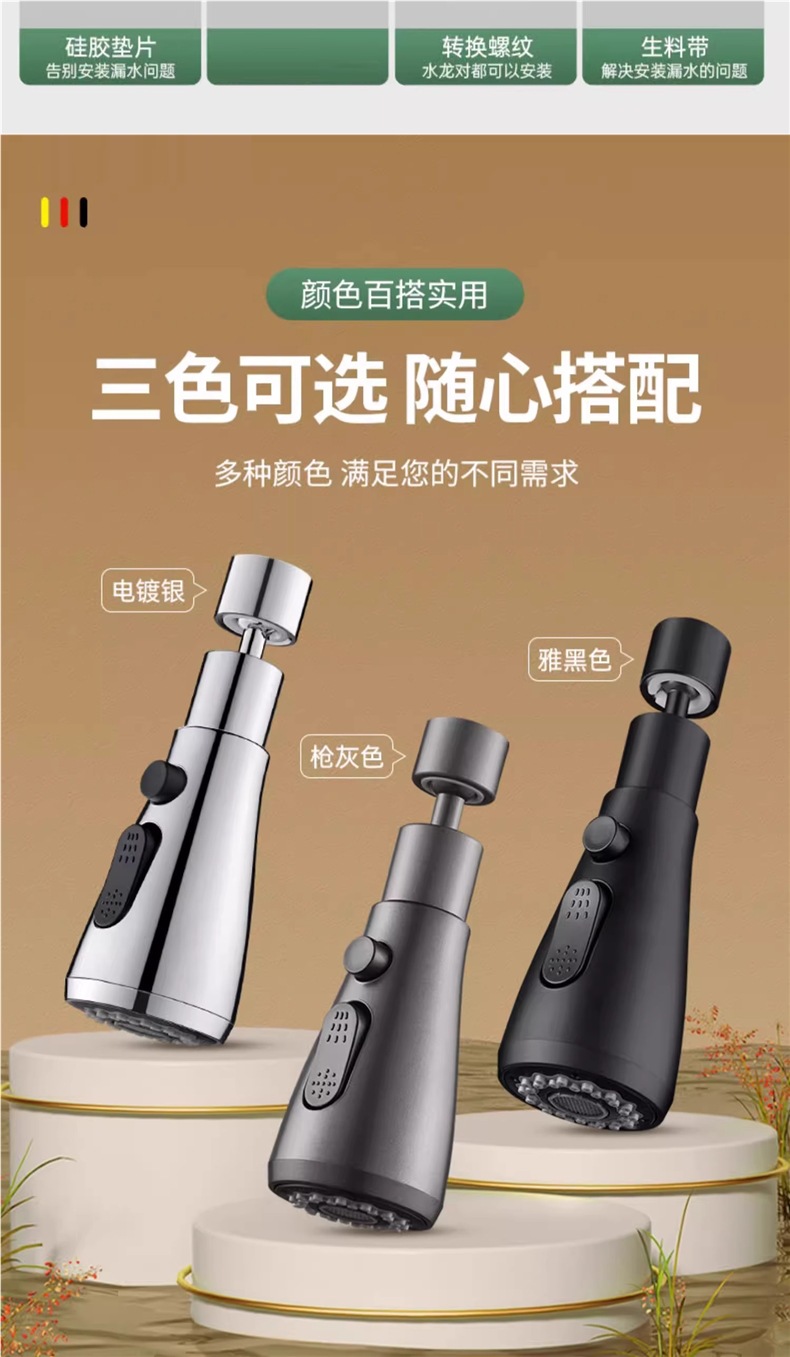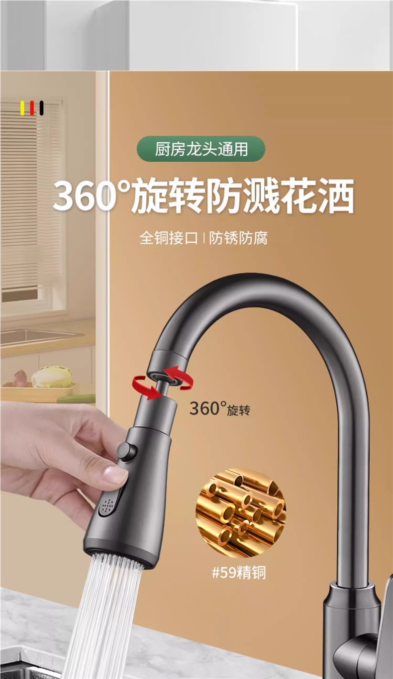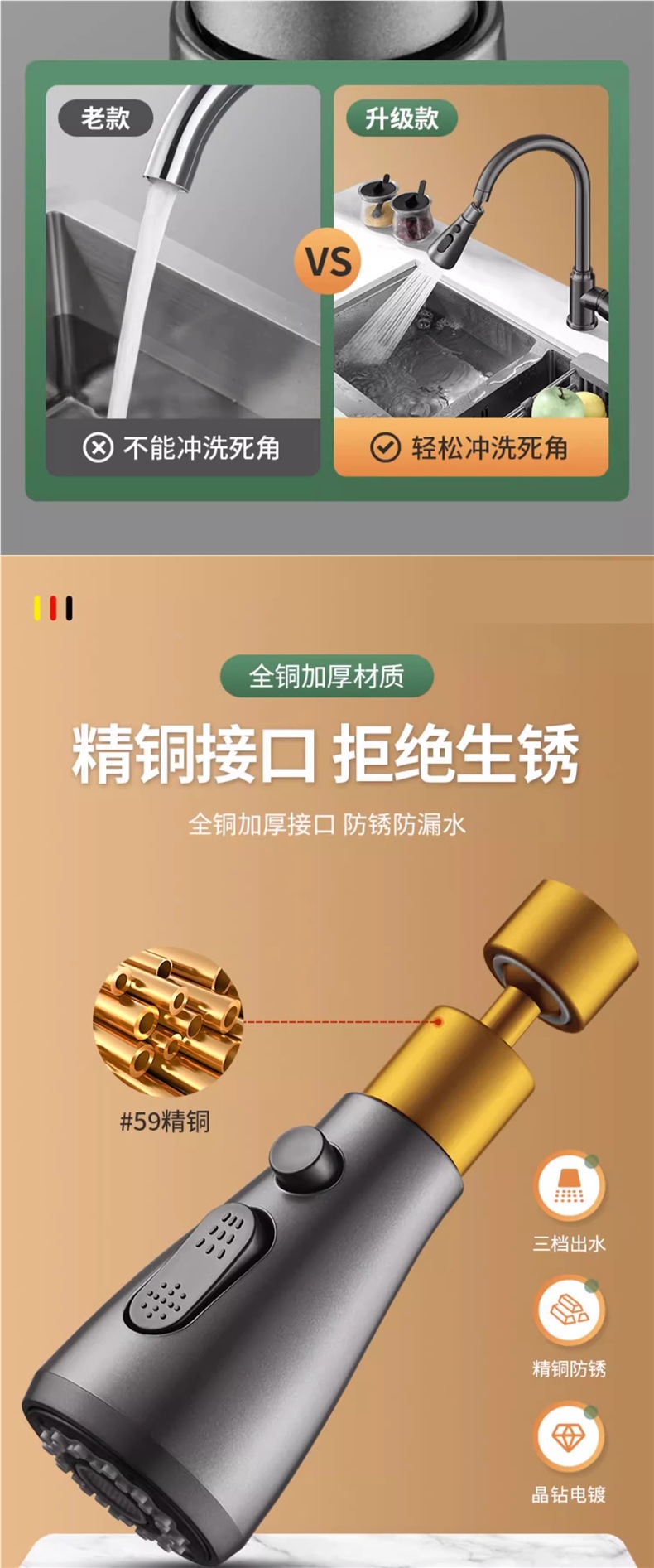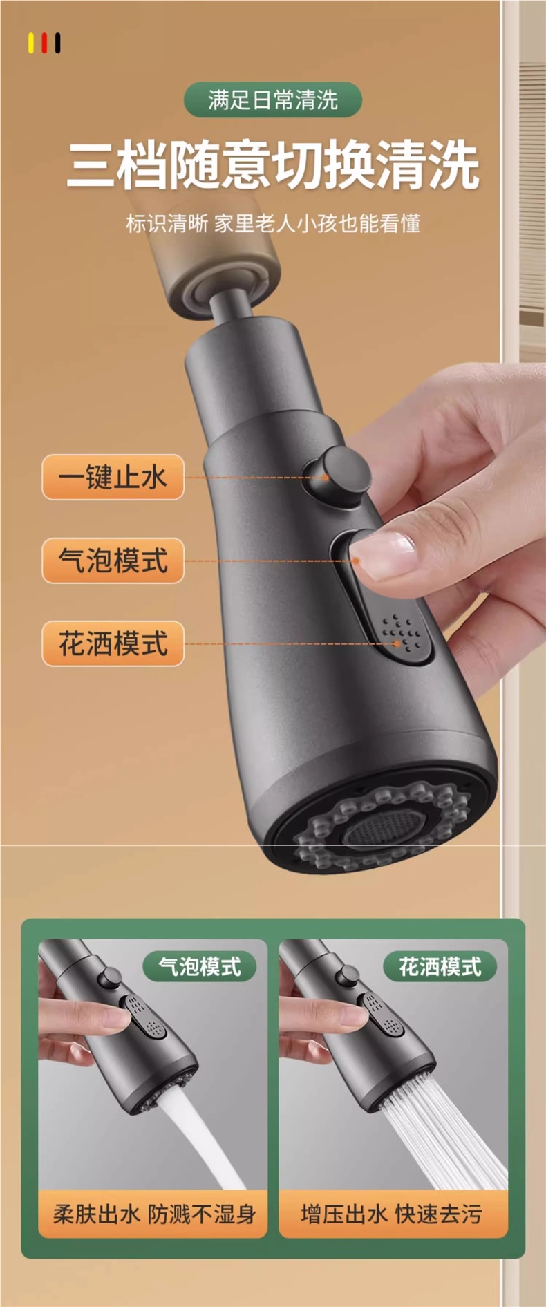 全铜材质,冷热通用,防溅节水 7星 360°旋转、三档出水、安装免工具、全铜防锈 家庭主妇、厨卫五金店、家装公司