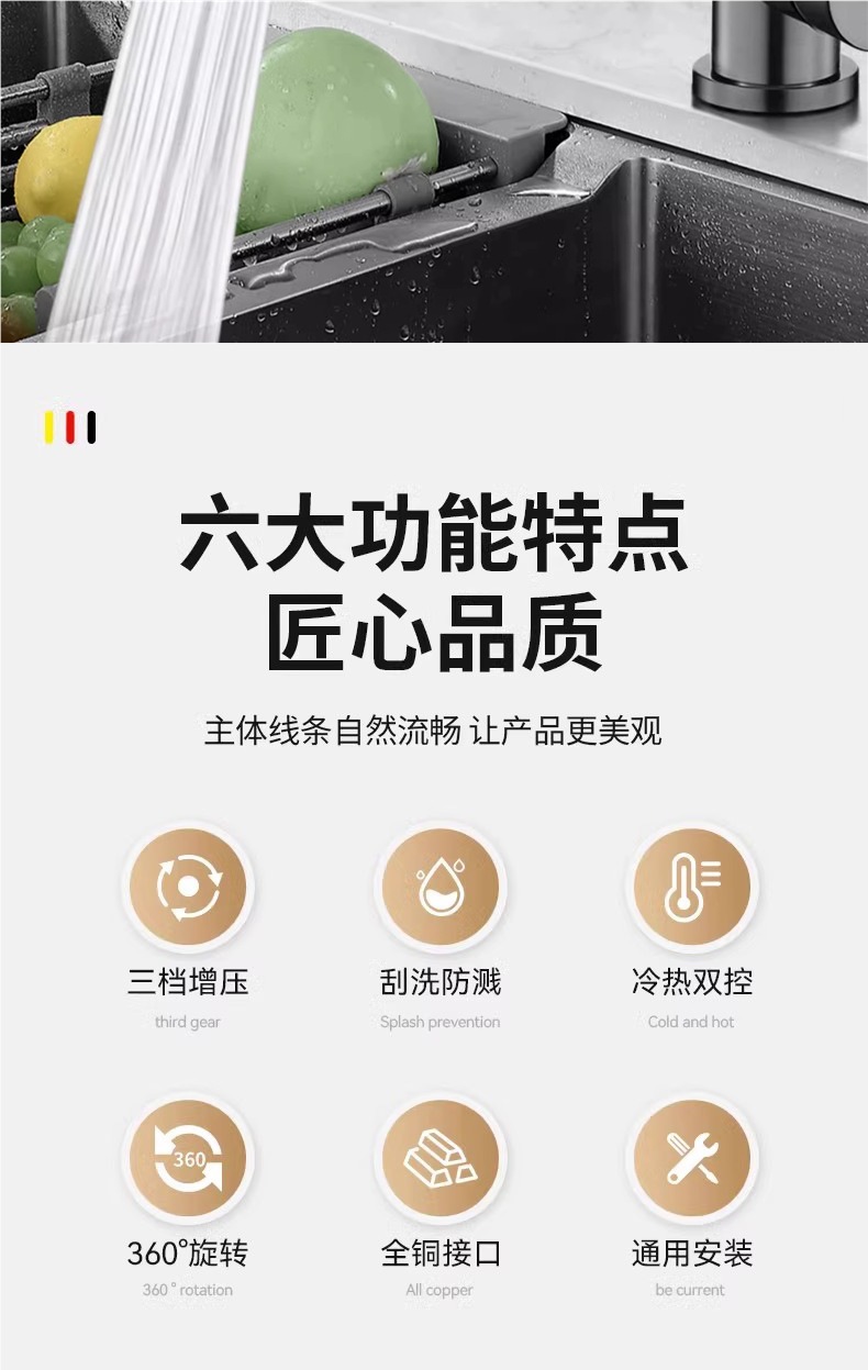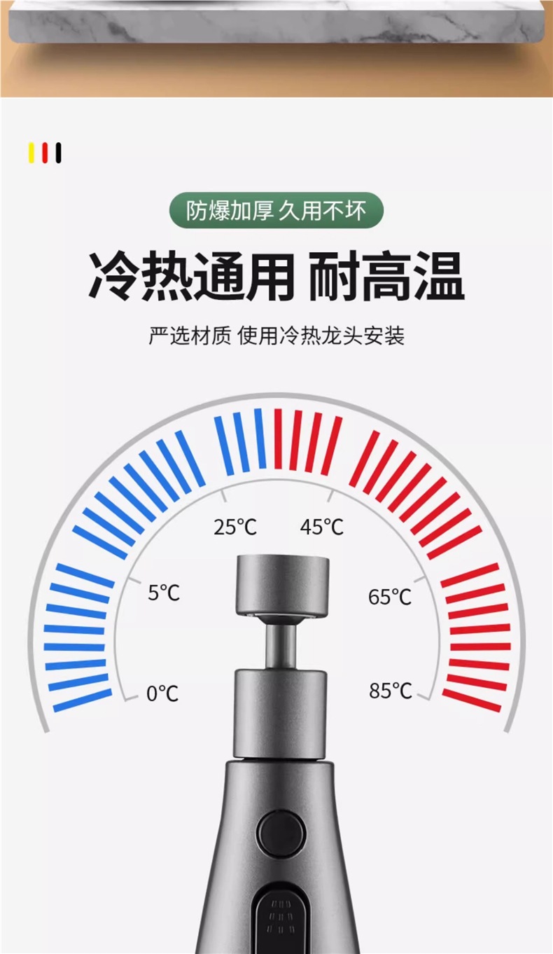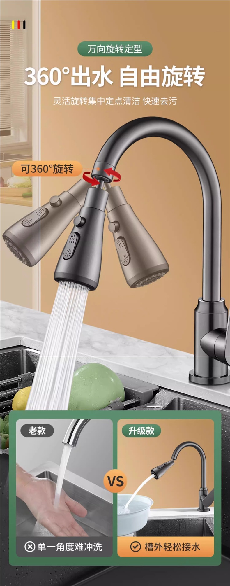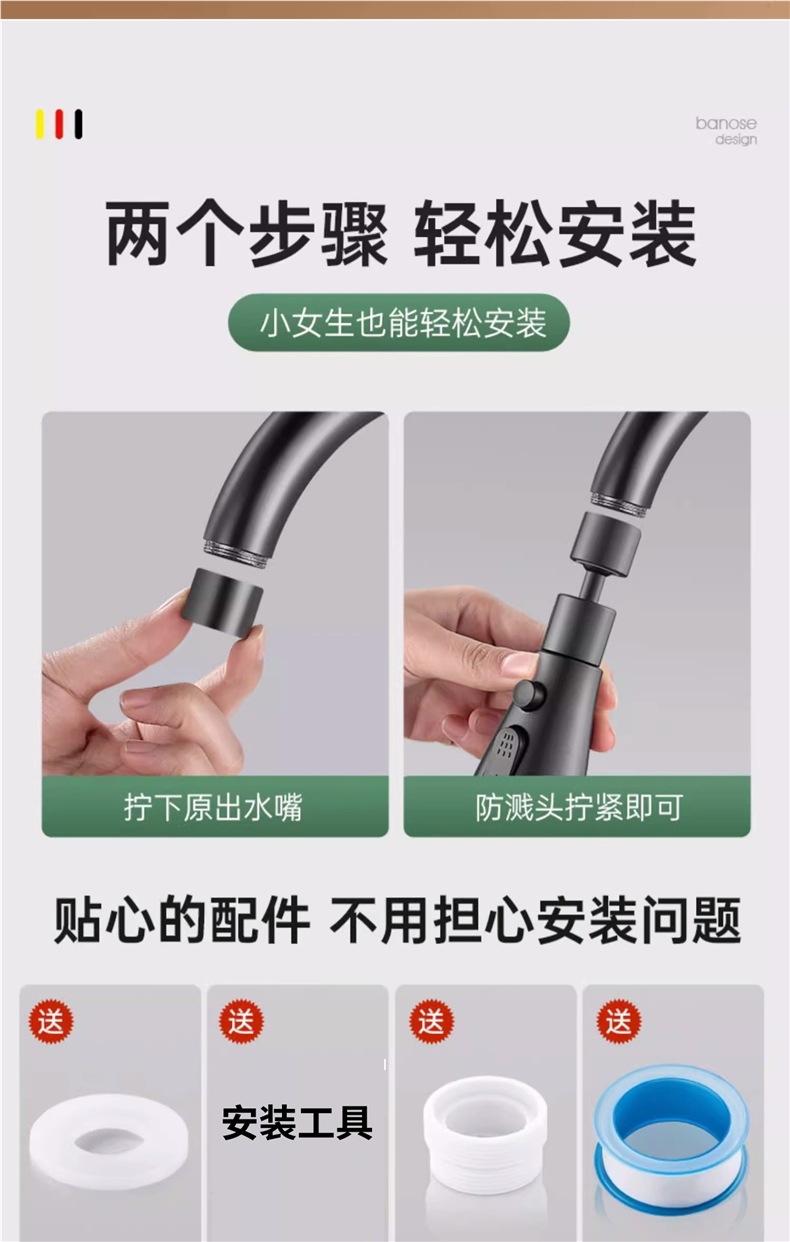 全铜材质,冷热通用,防溅节水 7星 360°旋转、三档出水、安装免工具、全铜防锈 家庭主妇、厨卫五金店、家装公司