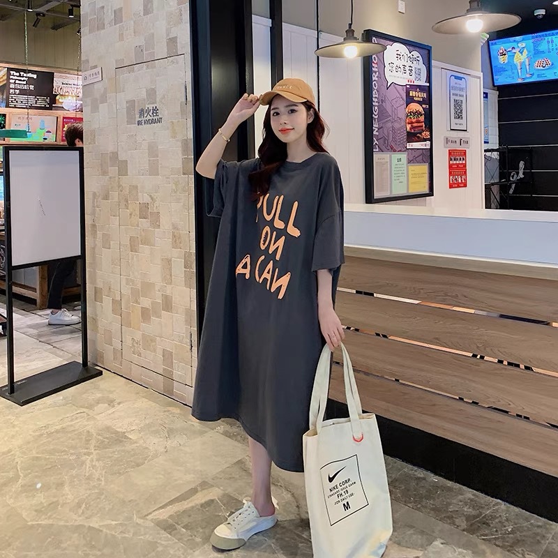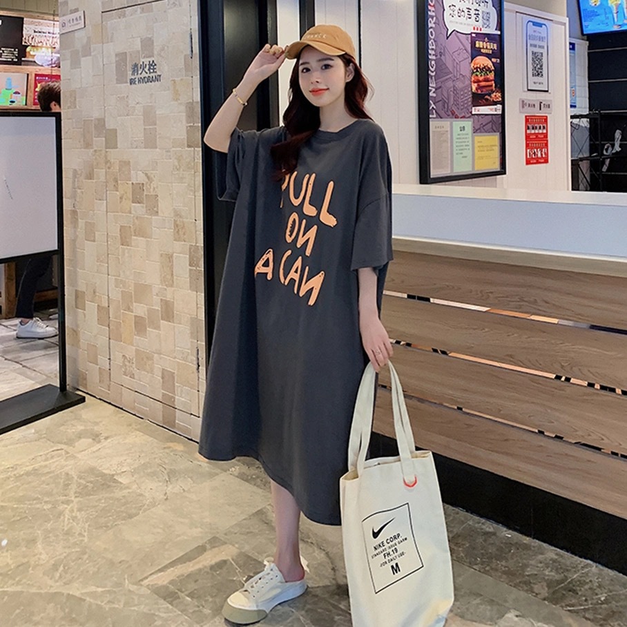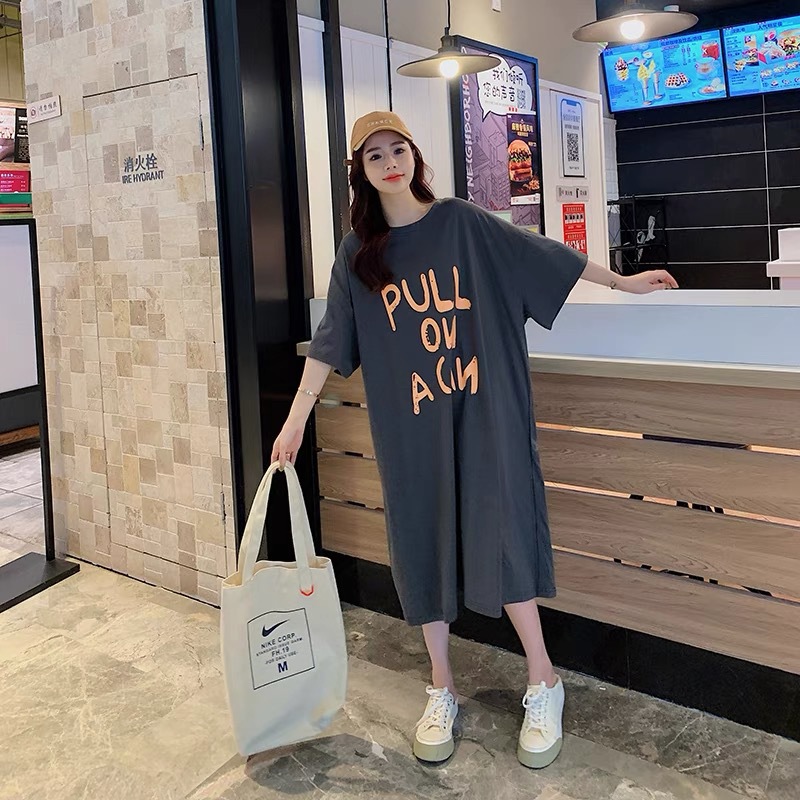 ins网红款韩系开叉个性字母印花T恤长裙中长款过膝连衣裙睡裙孕妇