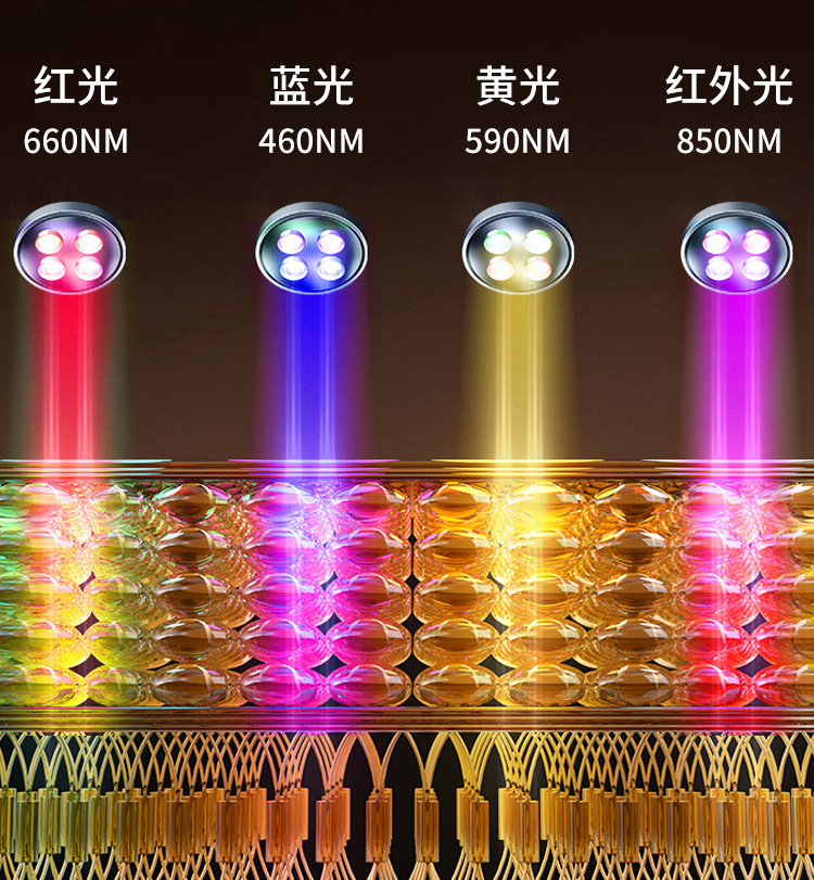 9.工作模式:四种,红光660NM+850NM 蓝光460NM+660NM+850NM 黄光590NM+850NM 紫光460NM+590NM+660NM+850NM