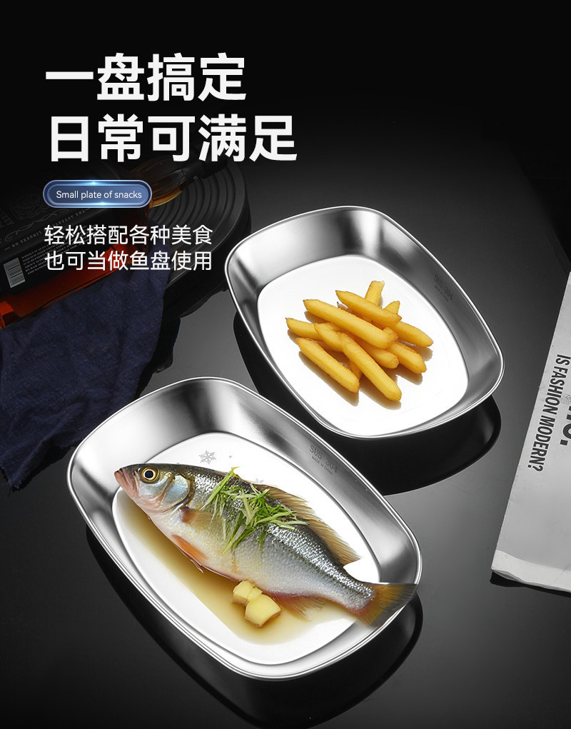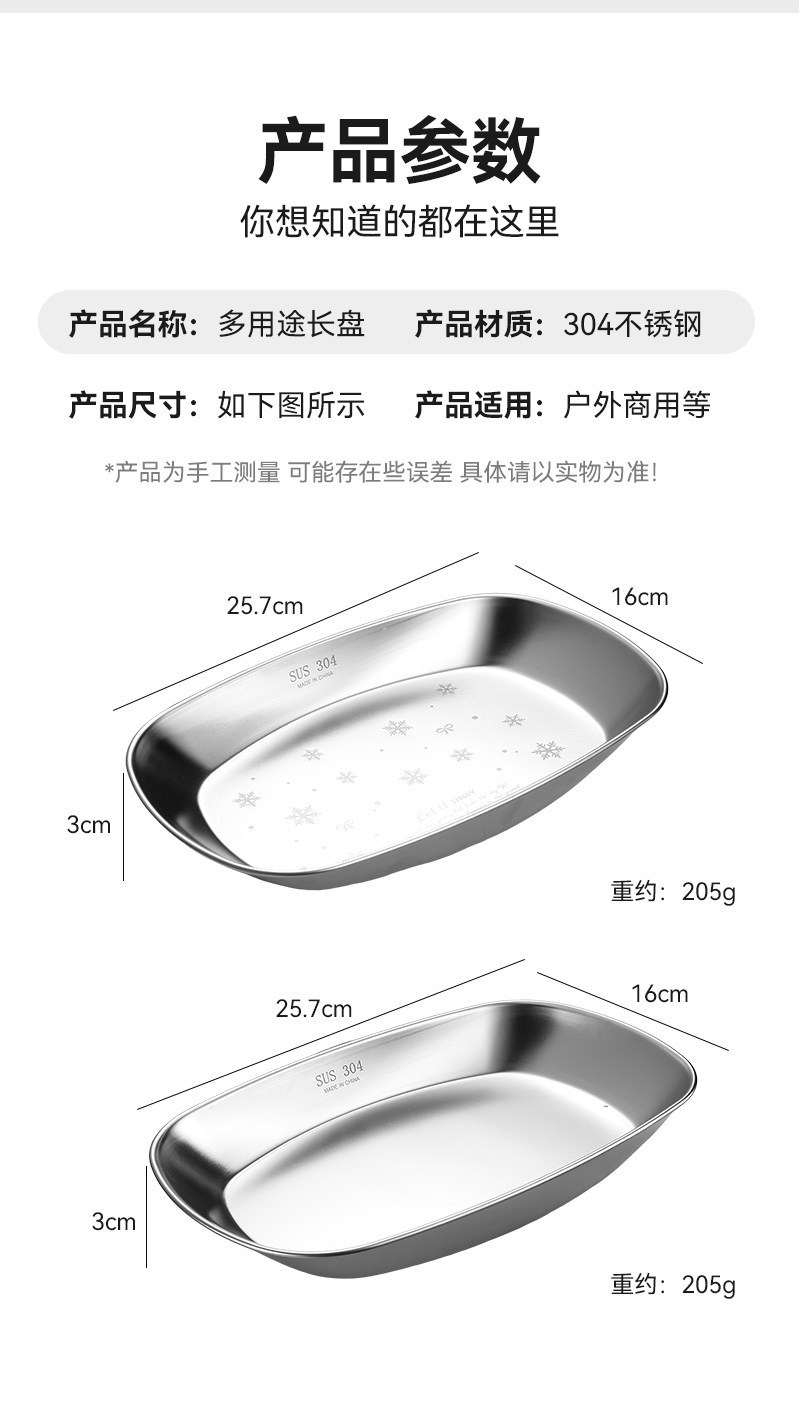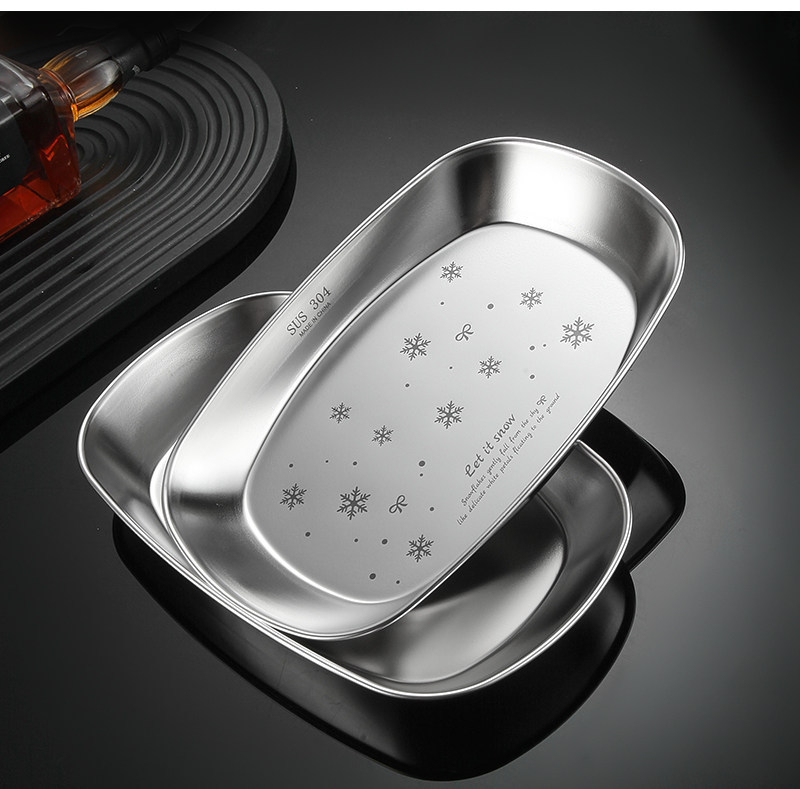 跨境304不锈钢雪花盘长方形小吃甜品盘烧烤平底盘家用备菜盘鱼盘