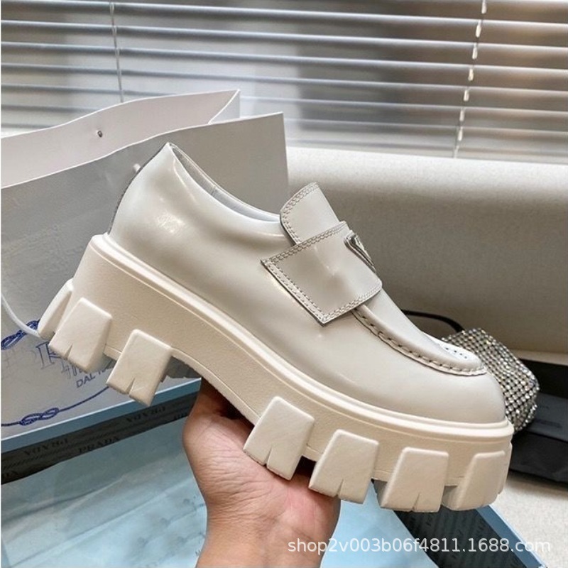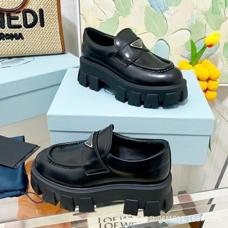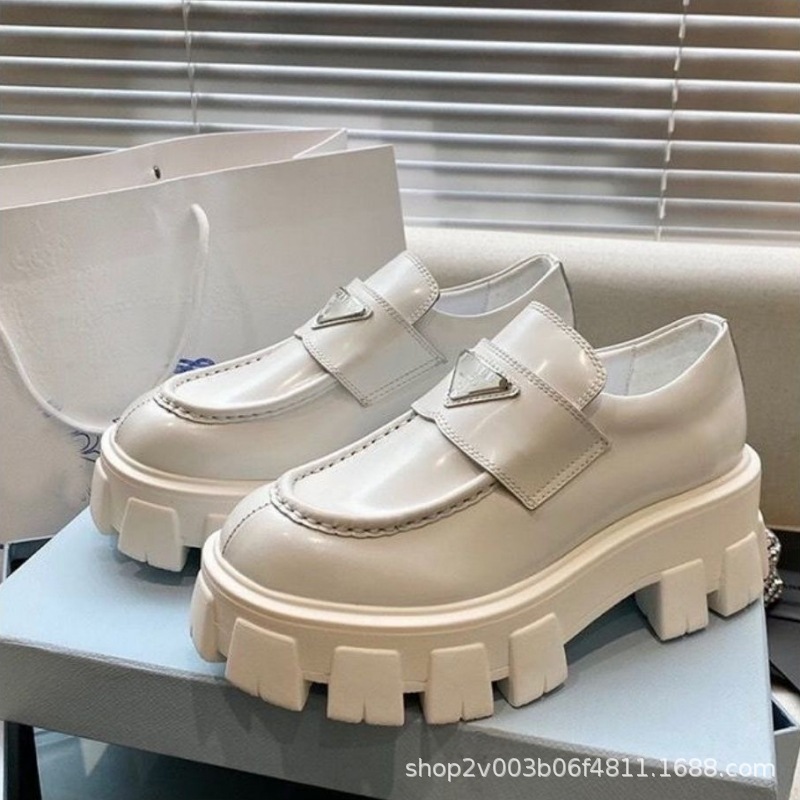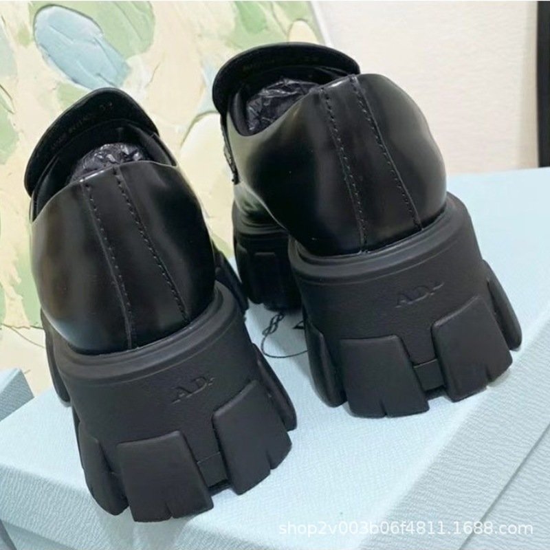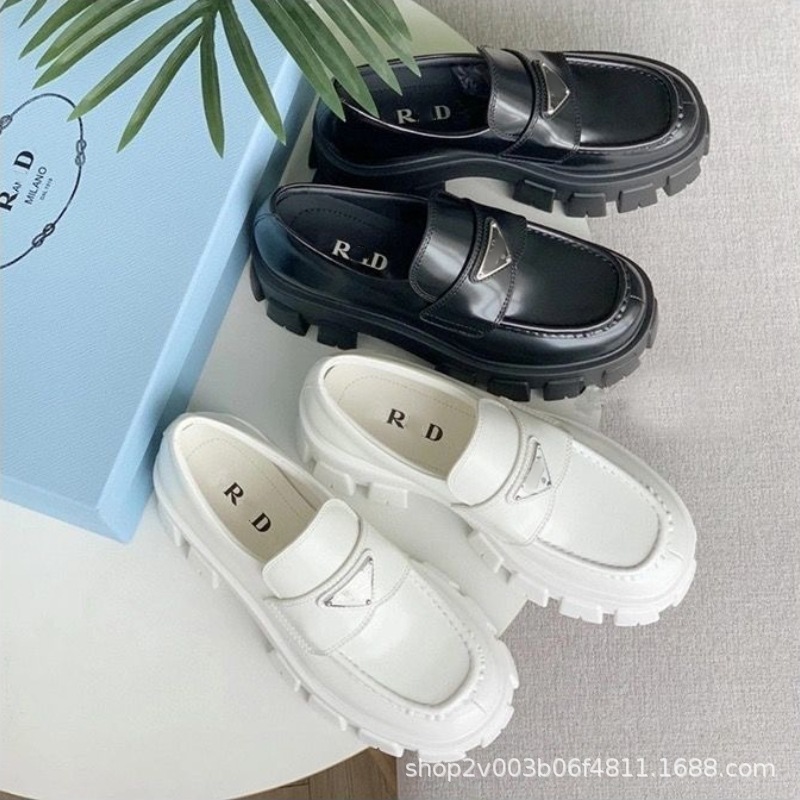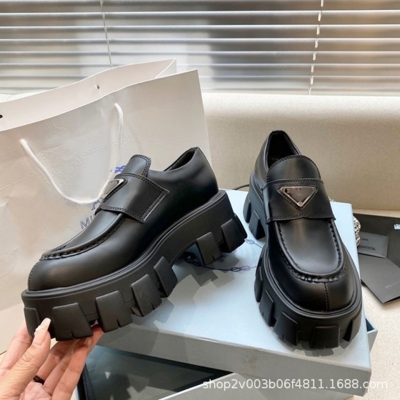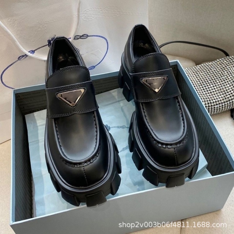 P家三角标乐福鞋女厚底英伦风单鞋2023新款复古黑色一脚蹬小皮鞋