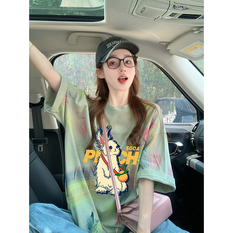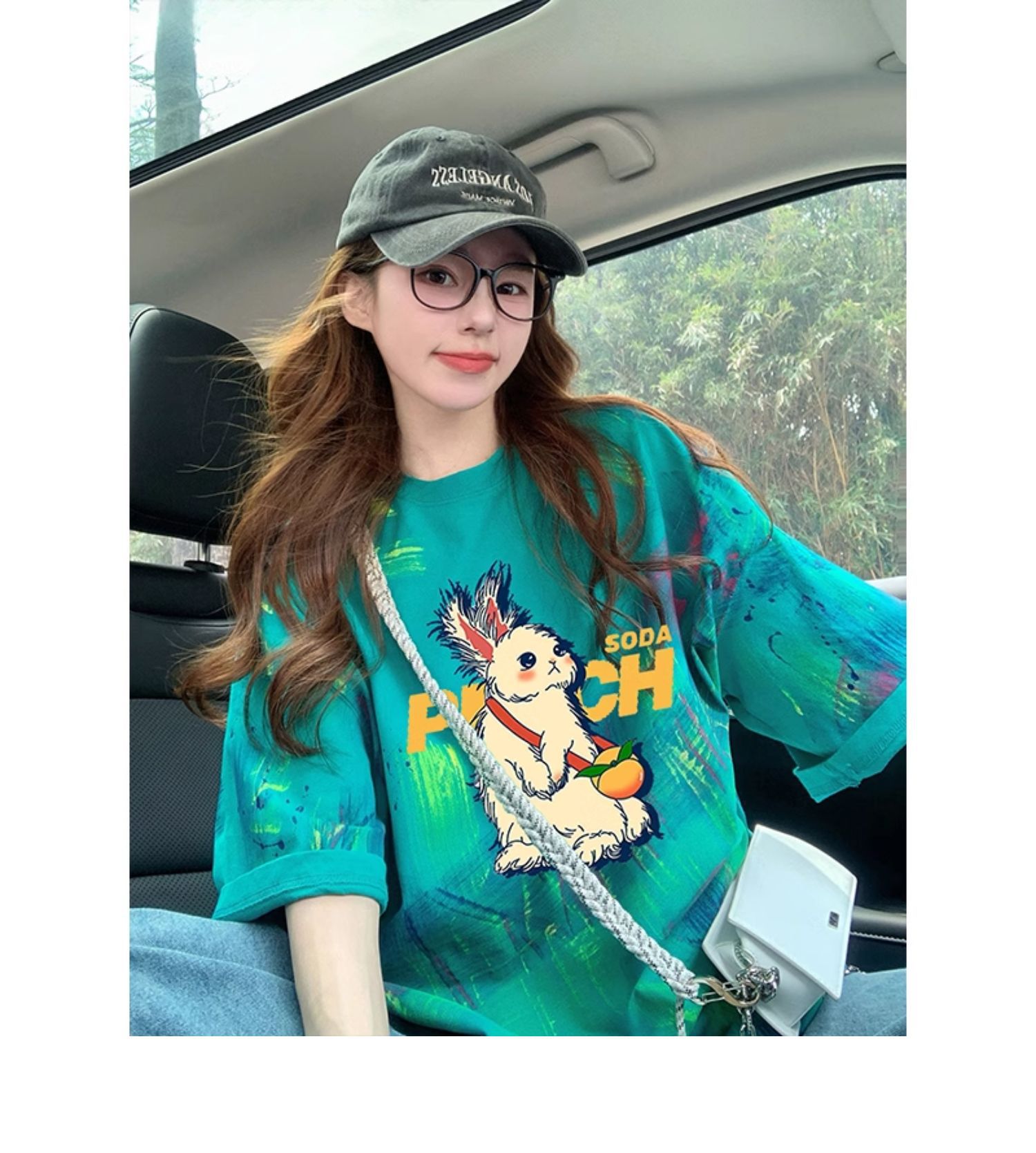 涂鸦兔子字母T恤宽松纯棉短袖女夏季ins风卡通印花扎染上衣情侣款