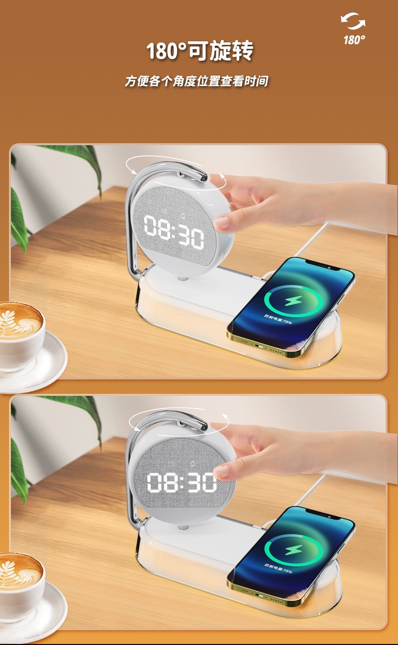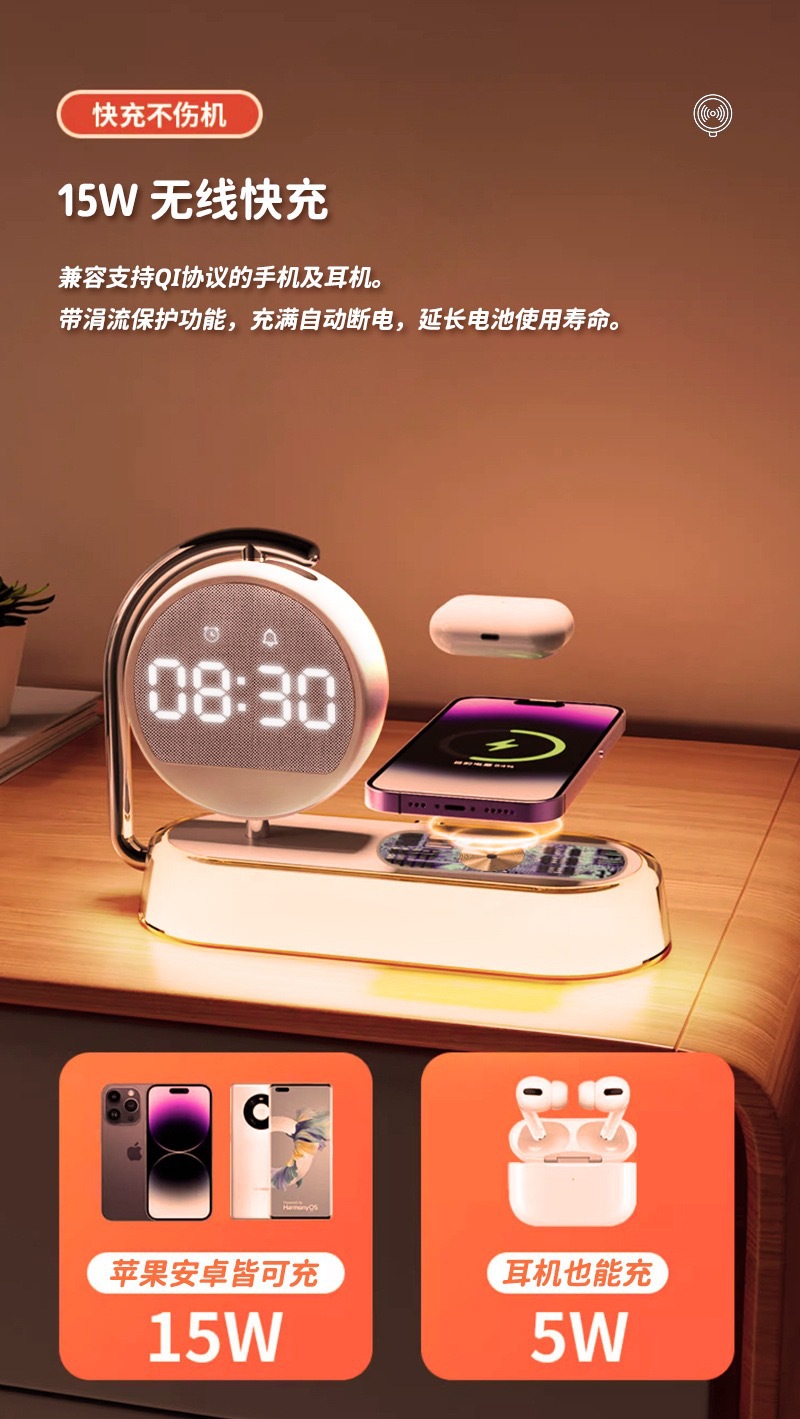 • 新款无线充蓝牙音箱炫彩氛围灯时钟闹钟桌面手机支架三合一无线充