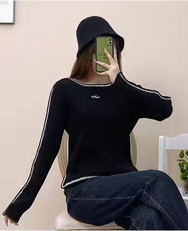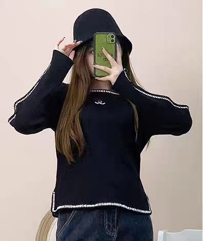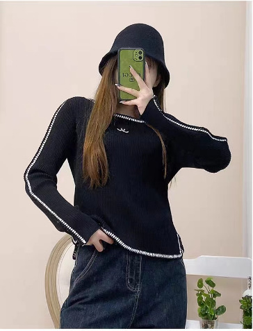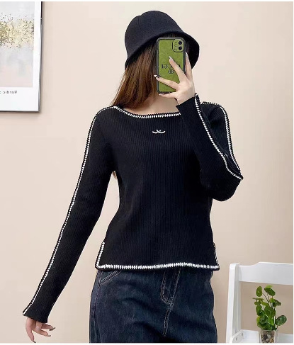 2023秋季撞色小香风手工编织字母刺绣套头显瘦针织上衣时尚百搭