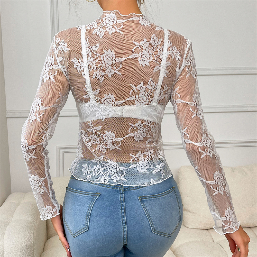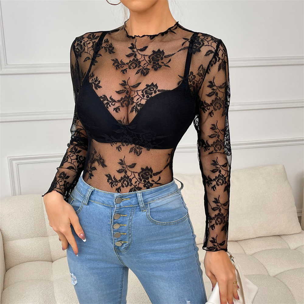 2025跨境蕾丝上衣 性感镂空衫女装 性感透视内搭长袖打底衫现货