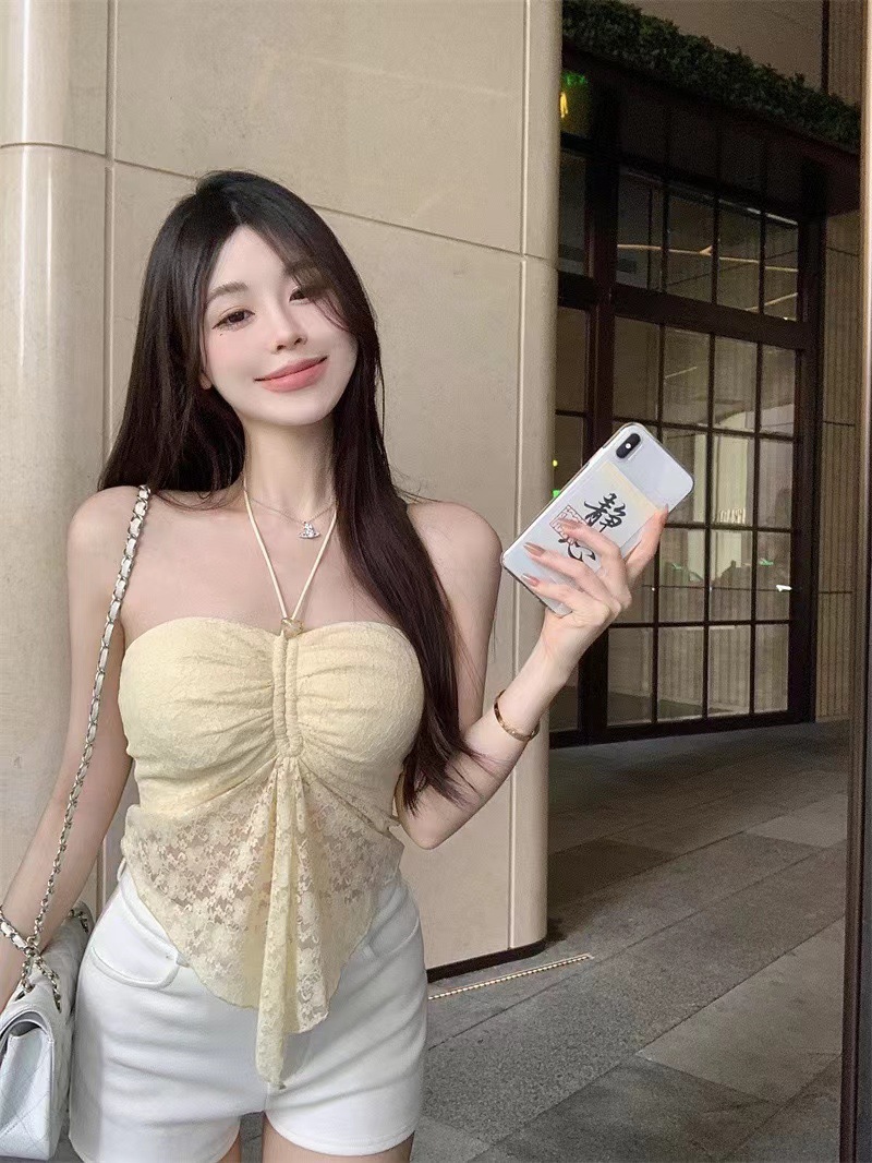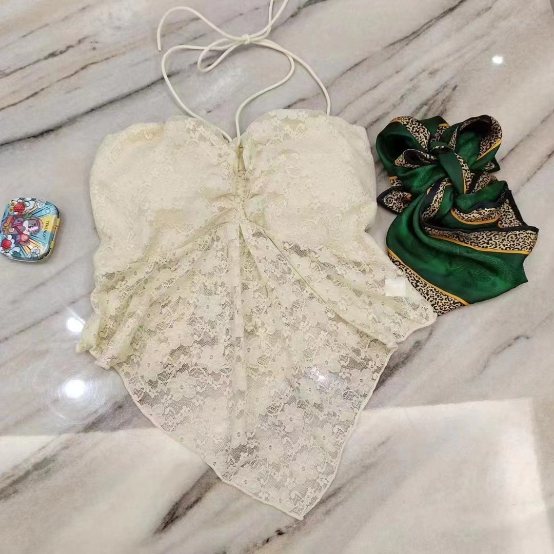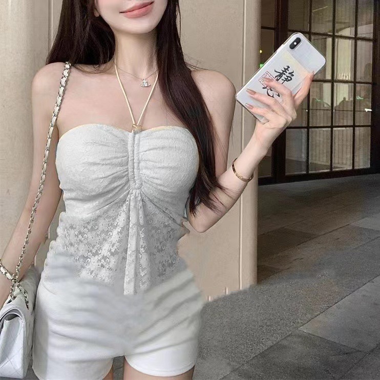 纯欲性感挂脖抹胸背心女带胸垫法式浪漫性感露背气质镂空蕾丝上衣